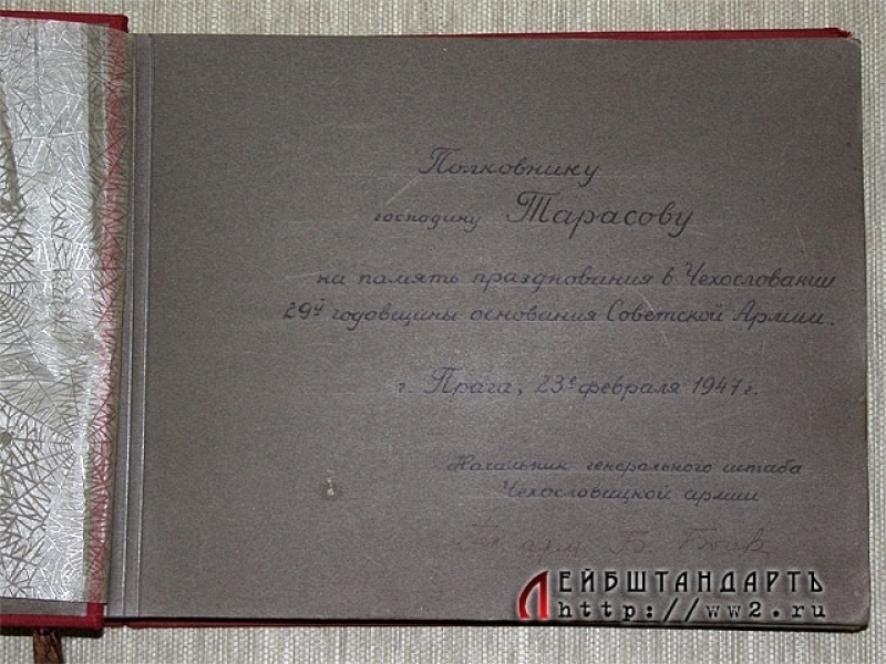 Красиво оформленный фотоальбом, подаренный полковнику Красной Армии Тарасову в честь празднования 29 годовщины основания РККА. Альбом подарили ему чешские коллеги в Праге 23 февраля 1947 года, так как полковник Тарасов в тот момент проходил службу в группе оккупационных войск в Чехословакии. На титульном листе имеется дарственная надпись за подписью Начальника генерального штаба Чехословацкой армии генерала Б. Бочева. Сам фотоальбом немецкий, довоенного выпуска. Отличное состояние.
