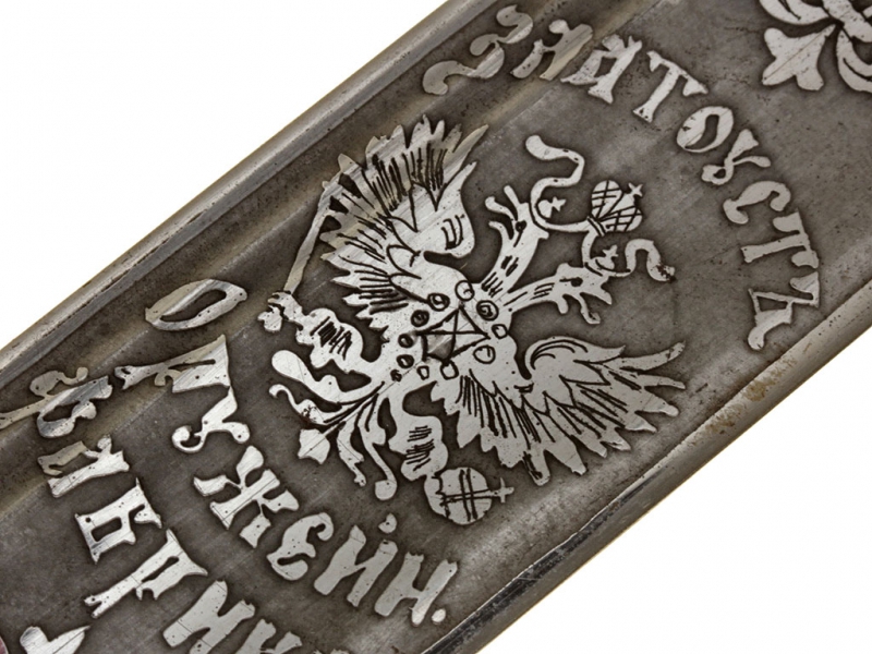 Редкий образец "подарочного" холодного оружия - шашка офицерская драгунского типа образца 1881 года в очень хорошем состоянии. Клинок никелированный, с лицевой стороны украшен нечастым вариантом нанесенного травлением медальона с изображением двуглавого орла и надписью "ЗЛАТОУСТЪ ОРУЖЕЙН. ФАБРИКА". У основания клинка - приемочные клейма "П" и "Ш". Рукоять из прокрашенного в черный цвет дерева, бронзовый прибор частично сохранил оригинальное золочение.