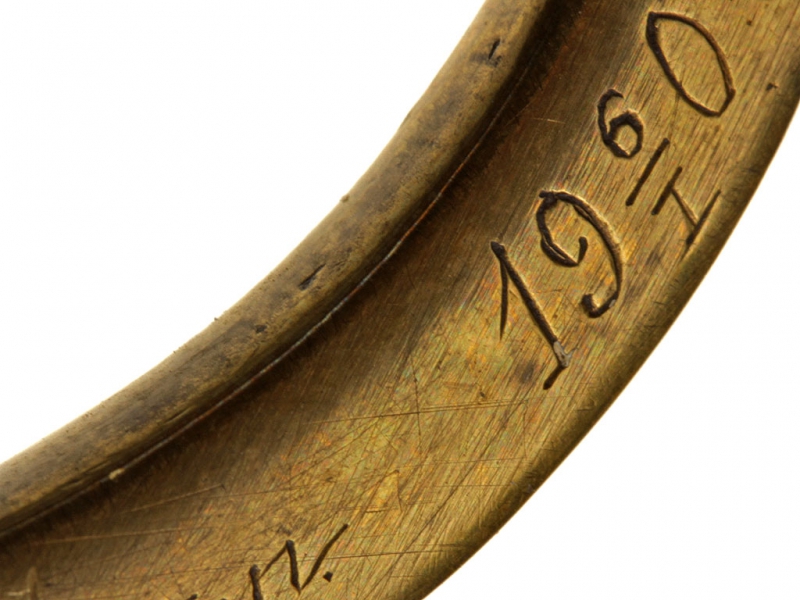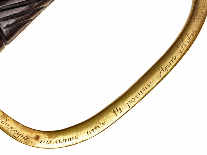На дужке имеется гравировка штихелем: "Любимому начальнику на долгую память отъ 14 роты Арт. Ковен. Креп. (артиллерии Ковенской крепости) 6.I.1908".
