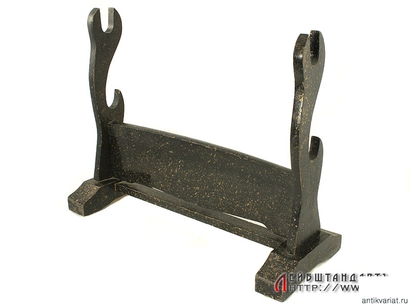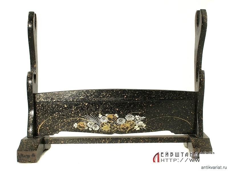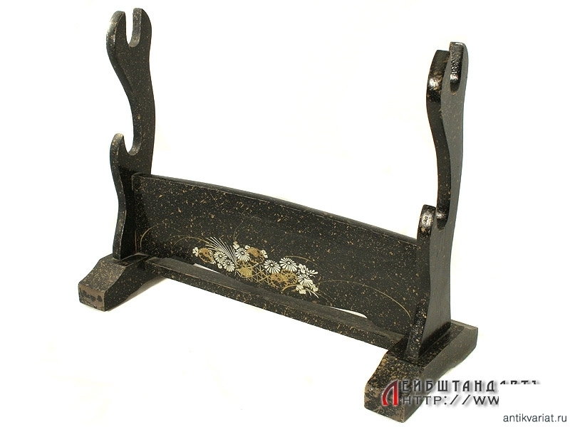Старинная подставка для пары мечей дайсё - катаны и вакидзаси. Изготовлена из дерева и покрыта черным лаком с изображениями золотистых и серебристых цветов на лицевой стороне. Датируется серединой - второй половиной XIX века. Очень хорошее состояние.