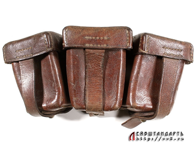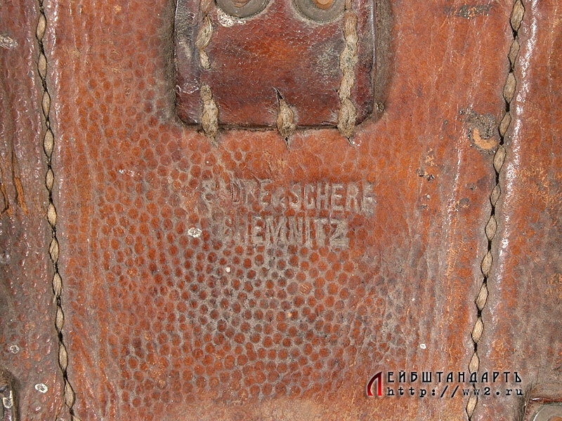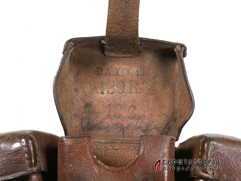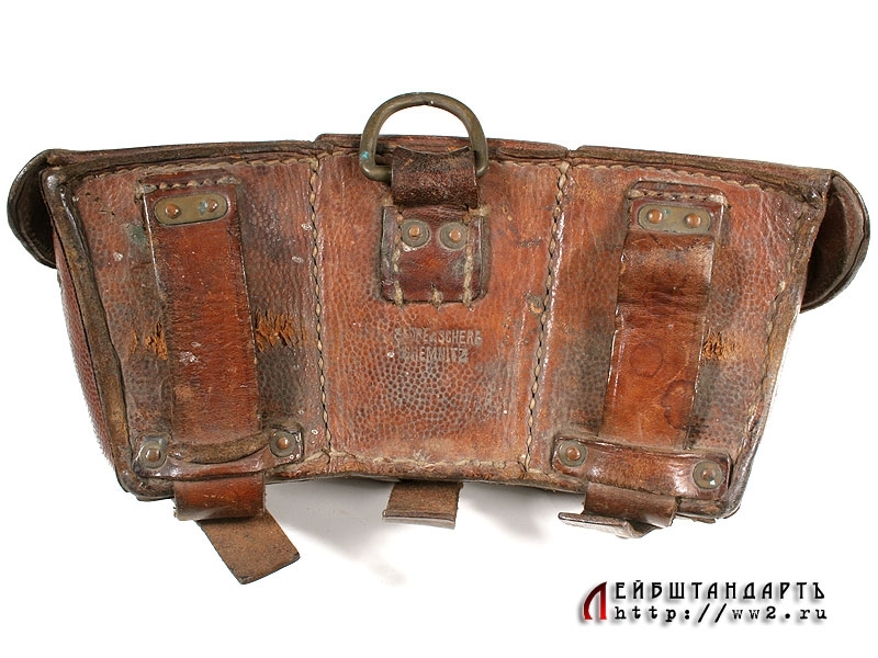 Кожаный подсумок для патронов к карабину Маузер К98 в очень хорошей сохранности. Это первый тип подсумка, рассчитаных на 9 обойм. Изготовлен перед либо в самом начале Первой мировой войны, заклепки латунные. На оборотной стороне имеется клеймо фирмы-изготовителя "Sadre & Schere. Chemnitz". Внутри крышки среднего подсумка находится клеймо Управления вещевого обеспечения 139 полка XIX армии.