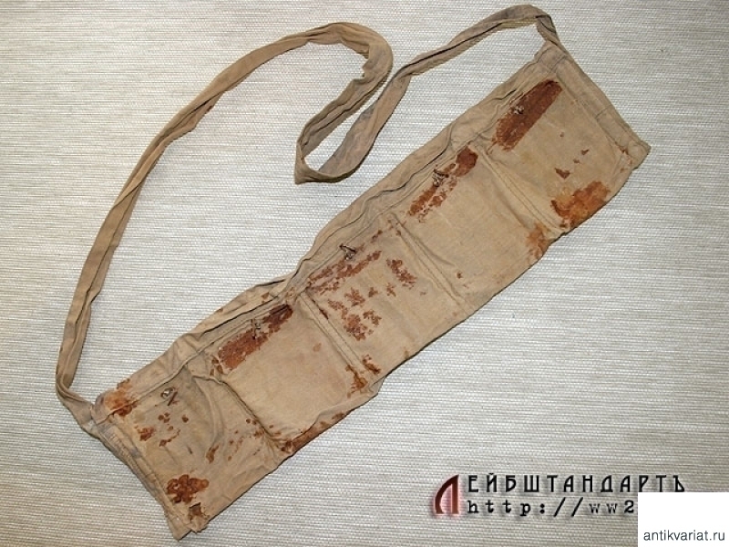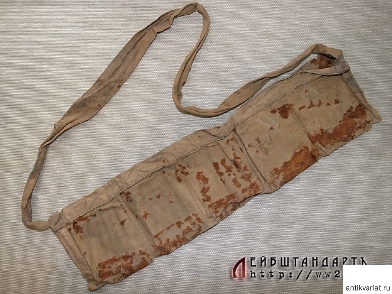 Крайне редкий матерчатый подсумок казачьего типа. Подсумок сшит из ткани защитного цвета, пятисекционный, секции застегиваются на медные крючки. Сбоку имеется клеймо: "Н.С.Р. 10/6/18". Одевался через плечо, пользовались им преимущественно в казачьих частях, но в годы Первой мировой войны им иногда пользовались и пехотинцы. Массового распространения он не получил, и изготовлено таких подсумков было совсем немного, так как в полевых условиях он плохо предохранял патроны от дождя и сырости. Пятна на ткани остались как раз от ржавчины: обоймы с патронами, лежавшие в подсумке, были железными.