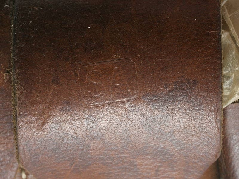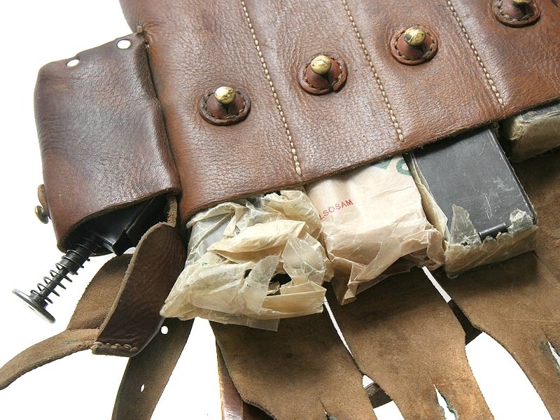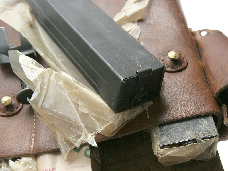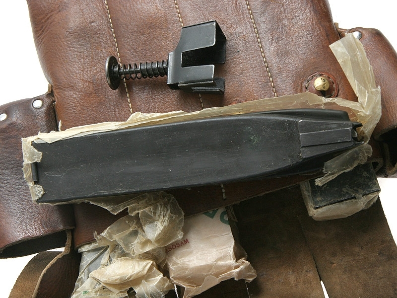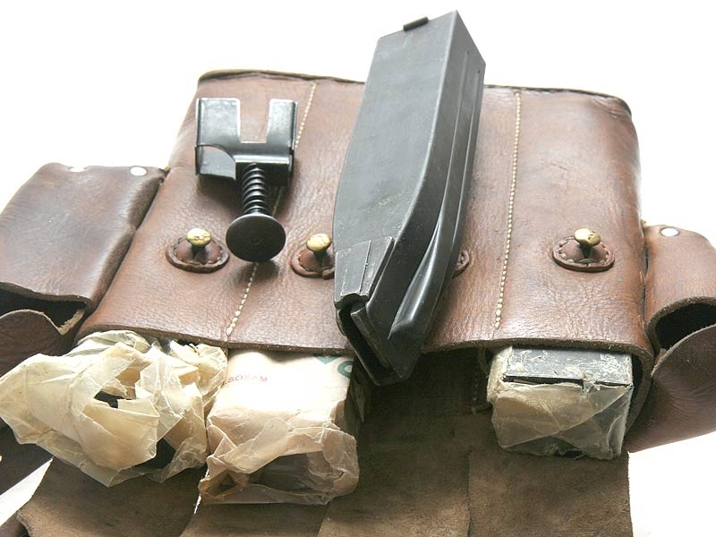 Кожаный подсумок с четырьмя четырехрядными магазинами на 50 патронов и заряжающим устройством к пистолету-пулемету Суоми образца 1931 года. Отличное состояние, магазины в упаковочной папиросной бумаге.