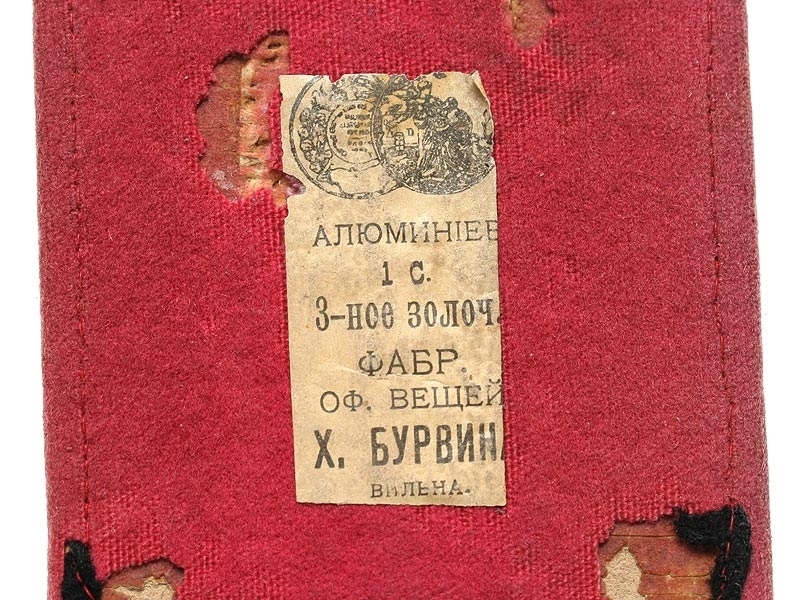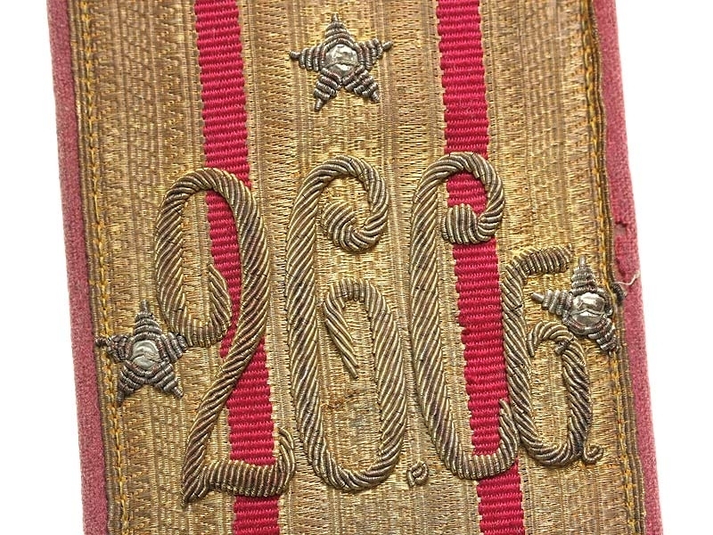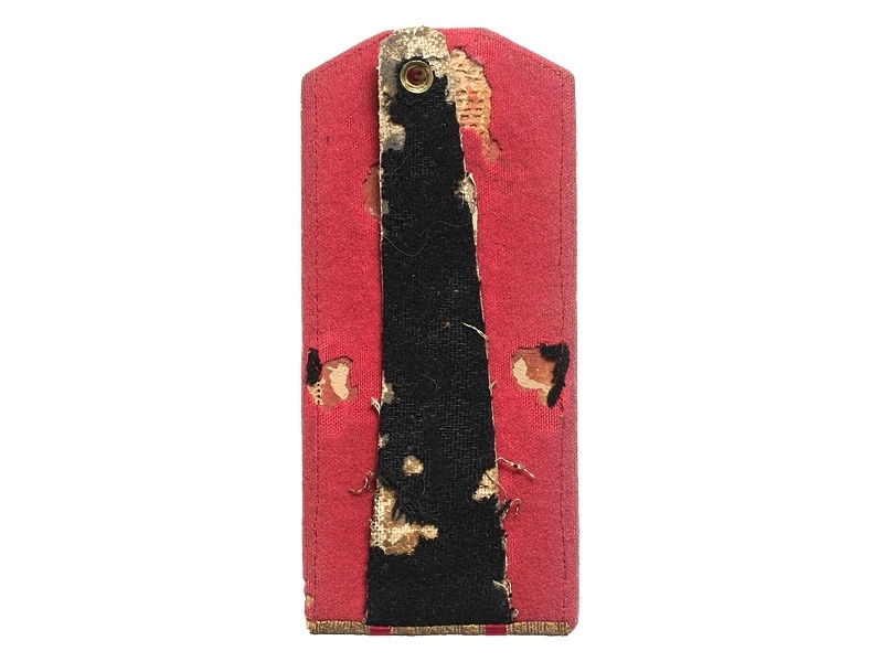 Одиночный погон подполковника 26-го Сибирского стрелкового полка в очень хорошем состоянии. Поверхность погон из позолоченного галуна с двумя красными просветами и малиновой окантовкой. Золотом вышит полковой шифр, звезды вышиты посеребренной нитью. Малиновая суконная подложка с остатками бирки магазина.