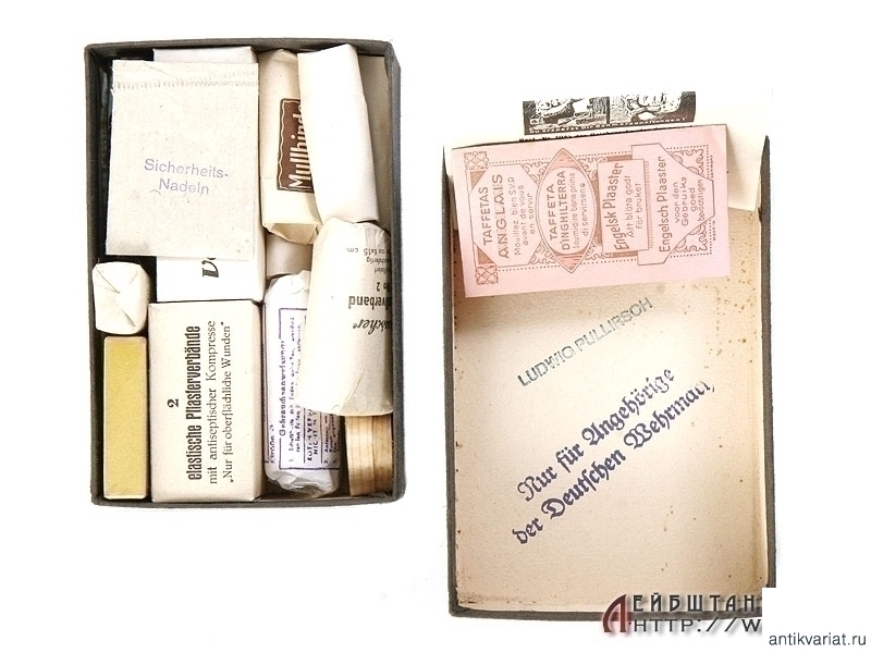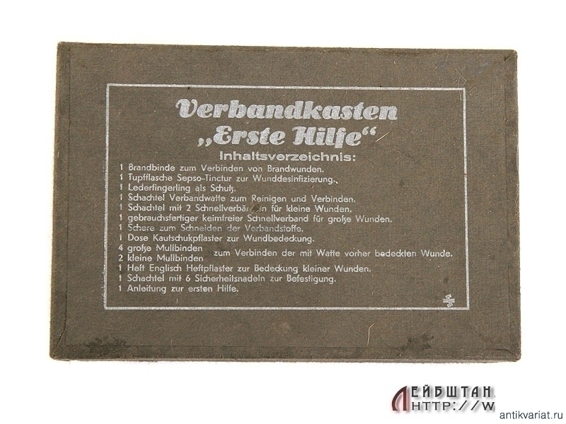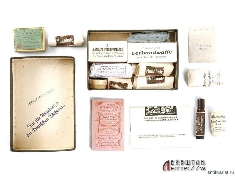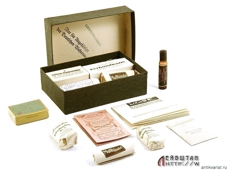 Идеальное состояние, полный комплект. Носилась в сухарной сумке. Аптечка укомплектована оригинальными бинтами, жгутами и пр. медицинскими принадлежностями. На крышке стоят клейма различных приемок Вермахта. Интересный довоенный предмет немецкого снаряжения.