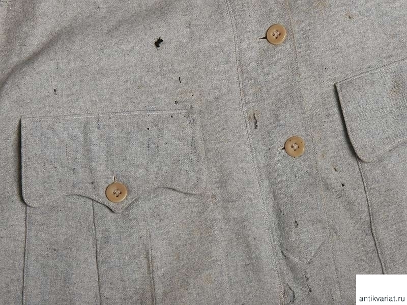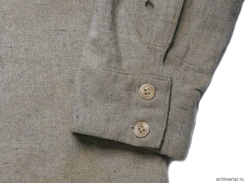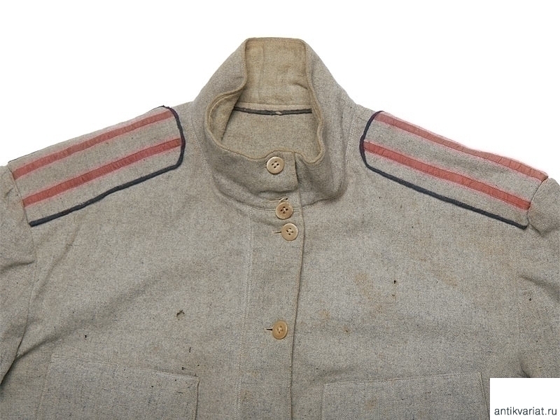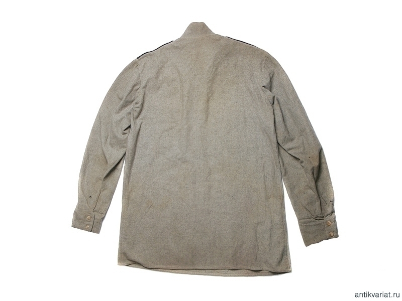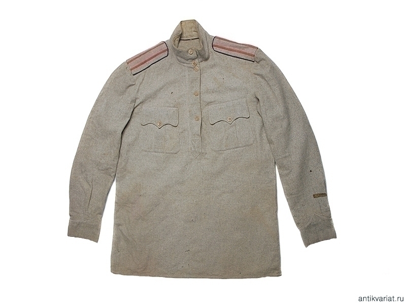 Полевая гимнастерка полковника 15 уланского Татарского полка периода Первой мировой войны. Сшита из сукна защитного цвета без подкладки, снабжена двумя нагрудными карманами с клапанами. Обшлага классического кавалерийского покроя. На левом рукаве имеется галунная нашивка за ранение. Все пуговицы оригинальные костяные, ничего не перешивалось. Погоны полевые, с двумя красными просветами и темно-синим кантом.