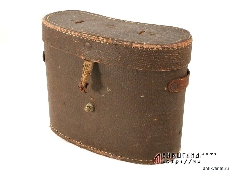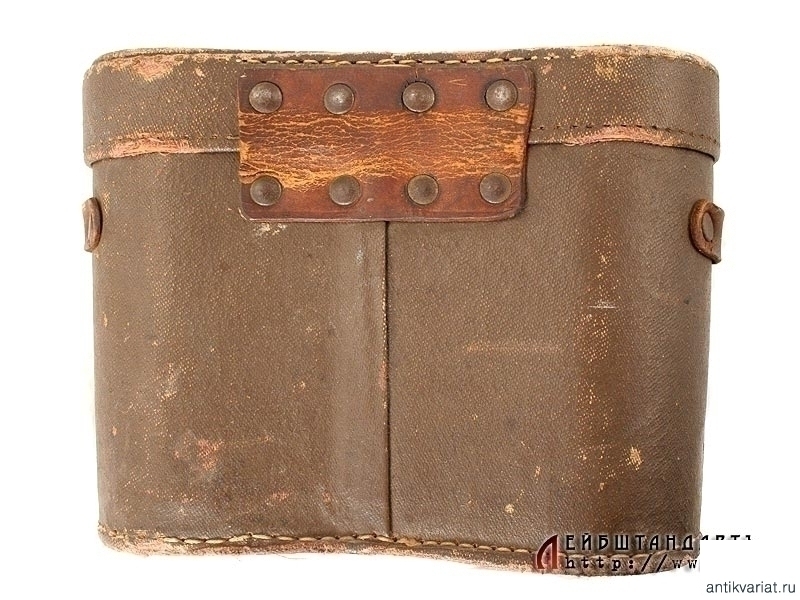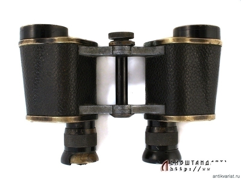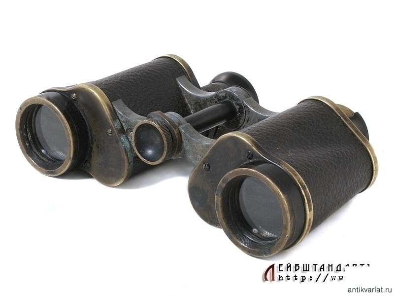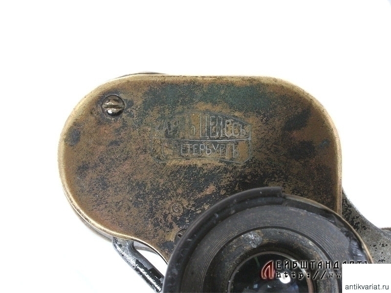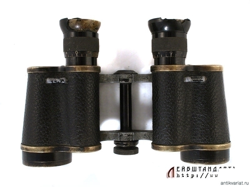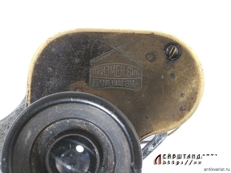 Армейский полевой бинокль, изготовленный в 1914 году известной фирмой Карл Цейсс, выполнявшей до Первой мировой войны в том числе и русские военные заказы. Предмет в очень хорошем состоянии, полностью сохранилась оригинальная черная краска и кожаная обклейка на окулярах, отличная чистая оптика. На основания окуляров серебряной накаткой нанесено название фирмы "Карлъ Цейссъ - С.Петербургъ", название изделия - "Призменный бинокль 6Х №1902" и год выпуска - 1914, а также изображение двух скрещенных винтовок. На эбонитовых основаниях окуляров имеются незначительные сколы.