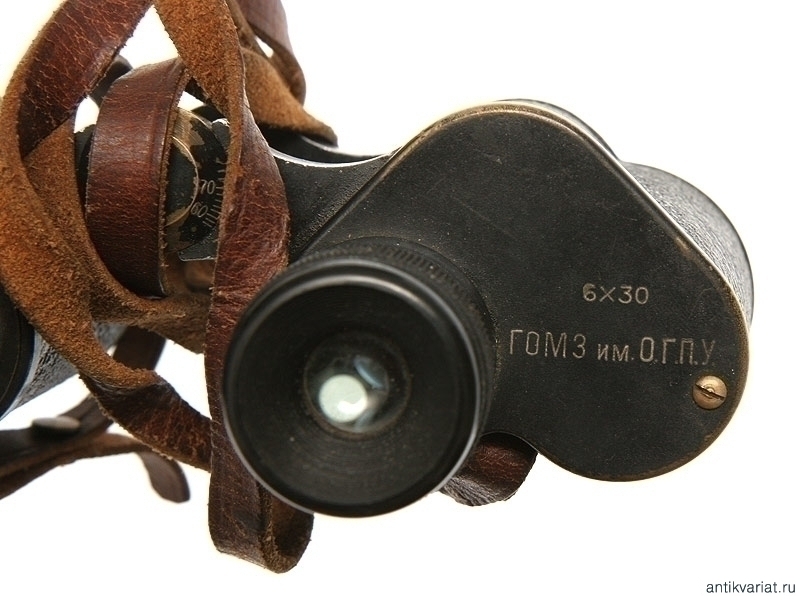 Полевой командирский бинокль 6 х 30 выпуска 1934 года. На основании правого окуляра - клеймо изготовителя "ГОМЗ им. О.Г.П.У.". Чистая, полностью исправная оптика, сохранился кожаный ремешок и футляр.