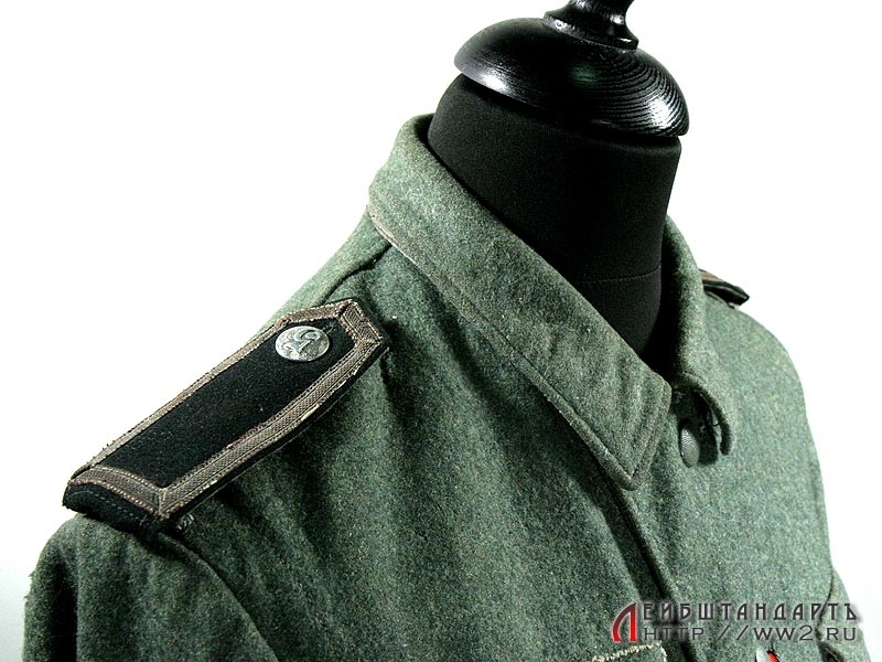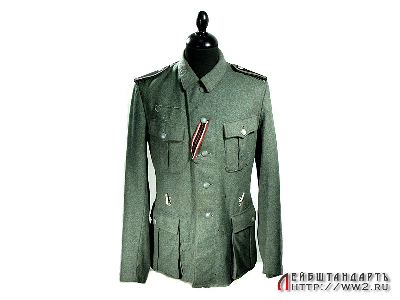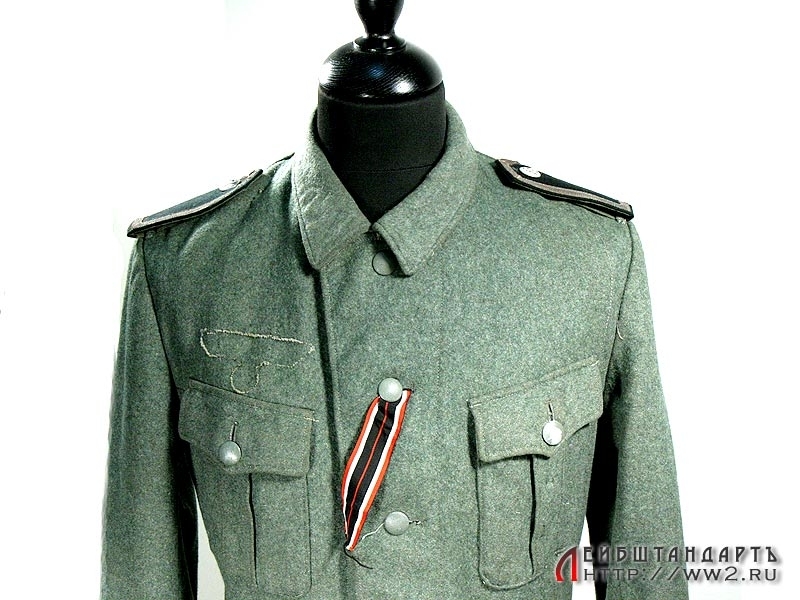 Полевой китель образца 1940 года, Вермахт, в очень хорошей сохранности. Китель продается в необшитом варианте, знаки различия спороты. В оригинальности погон, которыми он укомплектован, мы сомневаемся. На левом нагрудном кармане имеются следы от ношения квалификационных знака. В петлицу пропущена ленточка от Креста военных заслуг 2 класса. Размер примерно 46 - 48.