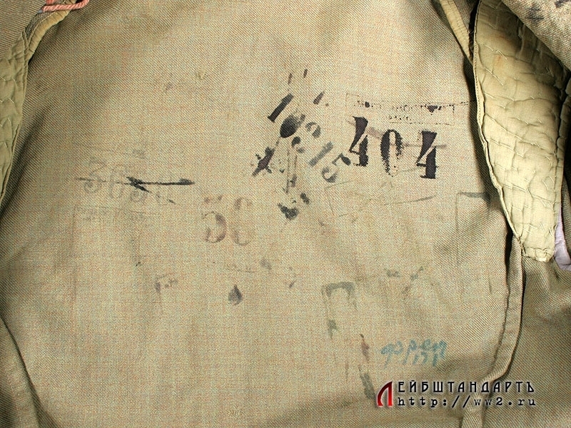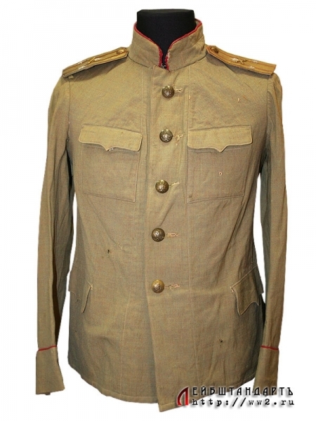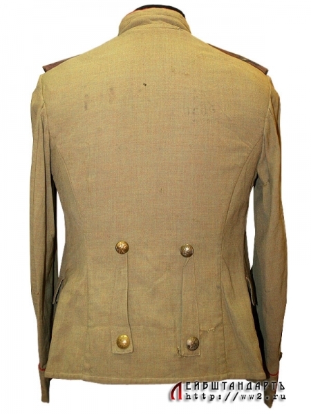 Полевой китель подполковника артиллерии времен Первой мировой войны в очень хорошей сохранности. Сшит из сукна защитного цвета, со стоячим воротником, по кромке которого идет малиновая выпушка (аналогичная выпушка идет по обшлагам рукавов). Плечи подбиты ватной подложкой. Застегивается на один ряд латунных гербовых пуговиц. Нагрудные карманы накладные, в левом имеется обметанное отверстие для полкового знака. Над карманом - специально вшитые петли для наград. Боковые карманы встроенные, с клапанами. Сзади также имеется два накладных клапана с четырьмя декоративными пуговицами. Без подкладки, на изнанке - многочисленные штампы.