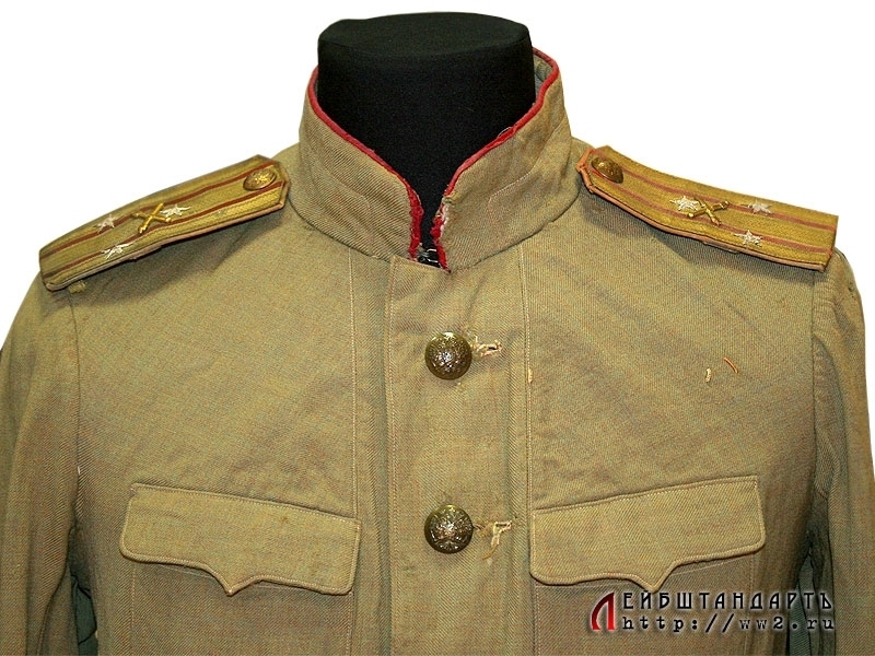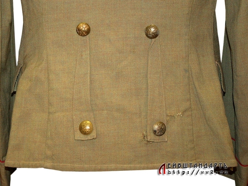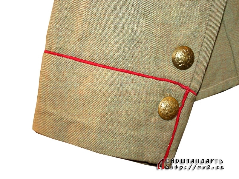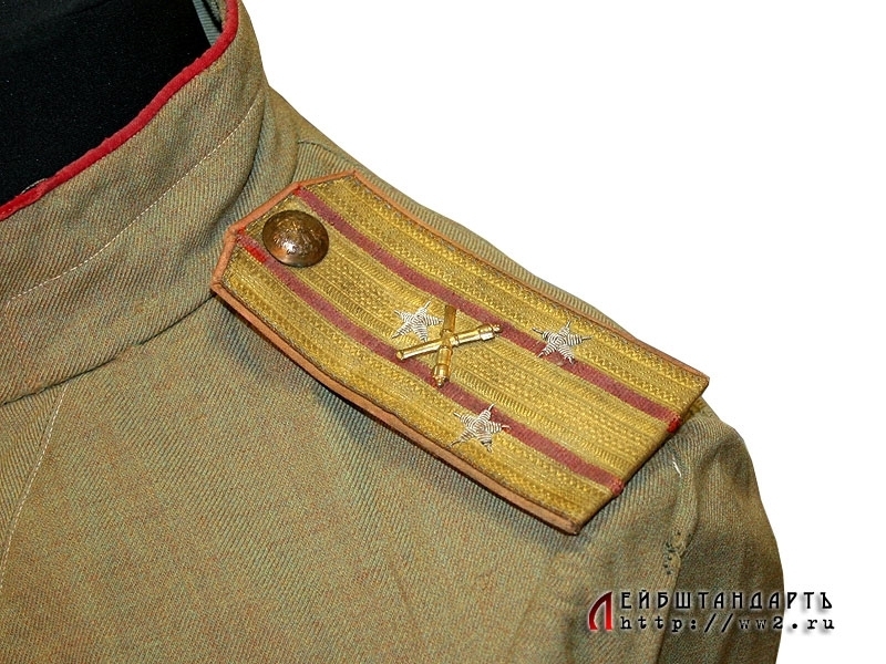 Погоны из позолоченного галуна с двумя красными просветами, с тремя шитыми серебряной нитью звездами. Скрещенные пушки накладные, из позолоченной латуни.