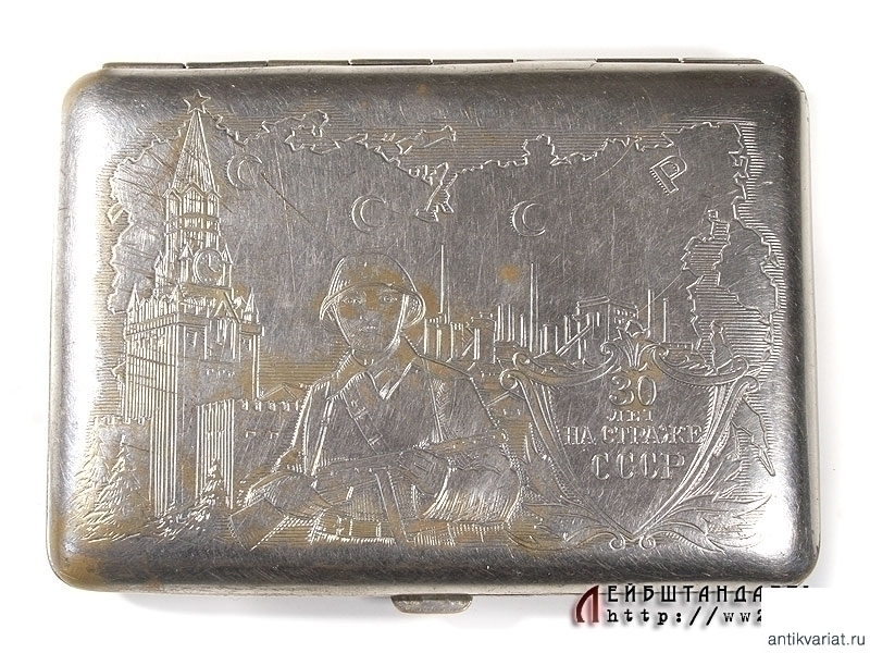 Портсигар выпуска конца 1940-х годов с изображением воина на фоне Спасской башни Московского кремля. На щите в правом нижнем углу присутствует гадпись: "30 лет на страже СССР". Изготовлен из никелированной латуни, почти полностью сохранилось оригинальное покрытие.