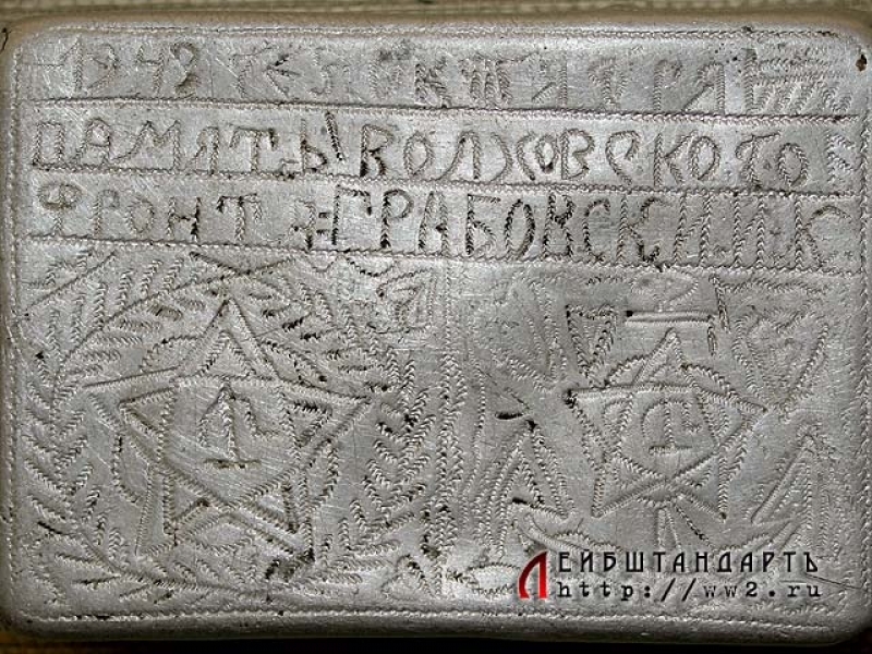 Классический пример солдатского фронтового творчества - самодельный алюминиевый портсигар с фамилией владельца - "И.К.Грабовский" и надписью: "Память Волховского фронта. 31 октября 1943 года". Судя по наличию дополнительной символики, владелец портсигара служил в морской пехоте.