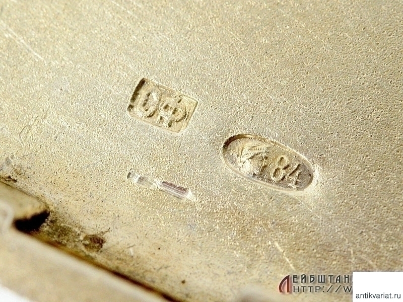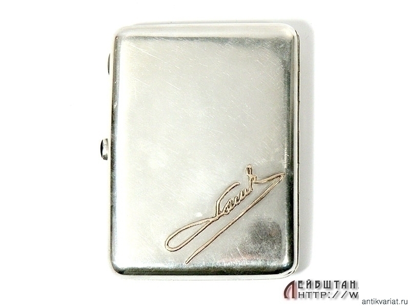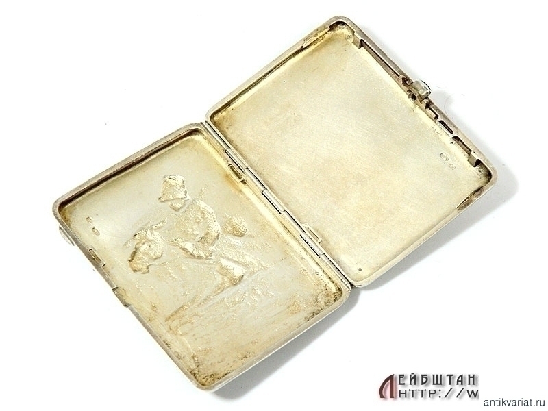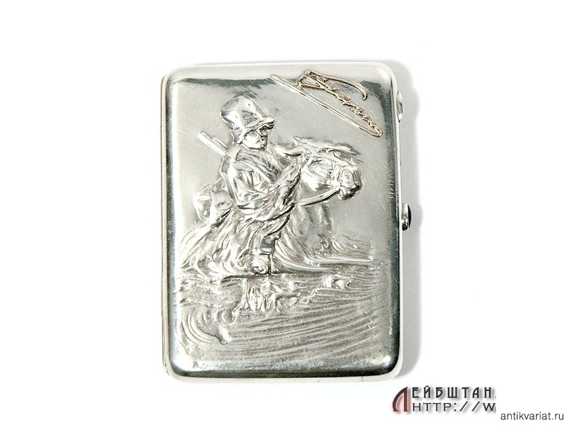 Массивный серебряный портсигар с рельефным изображением казака в полном снаряжении, переплывающего реку на лошади. Отличное состояние, высокий рельеф, украшен золотыми накладками - автографами. Изнутри сохранилось оригинальное золочение, имеются пробы "84" и клейма мастера "СФ".