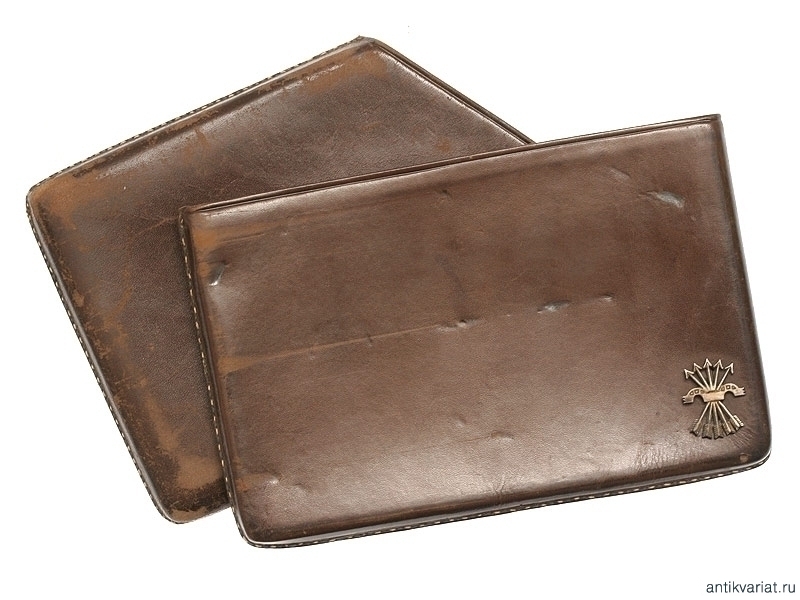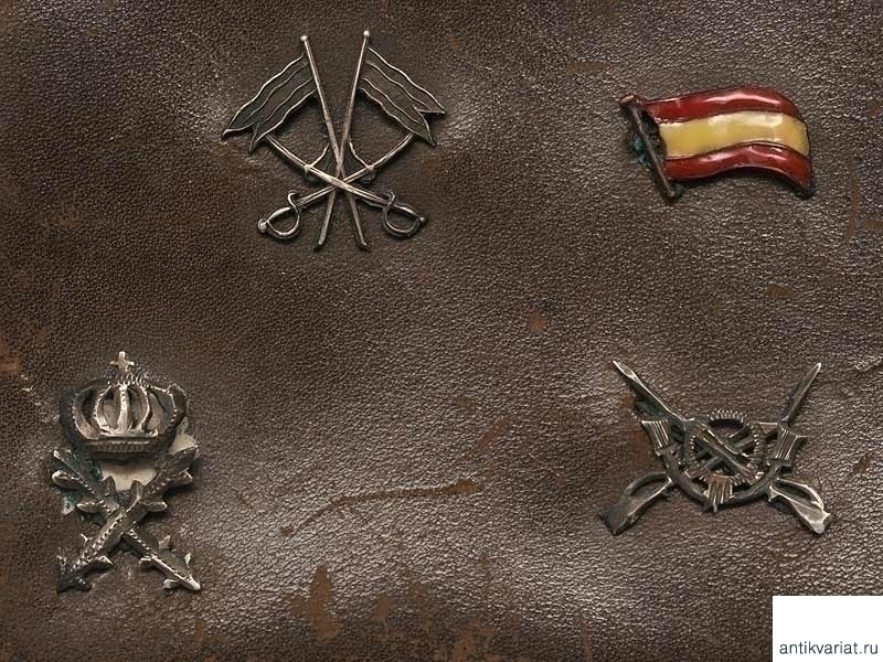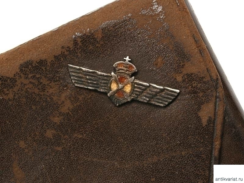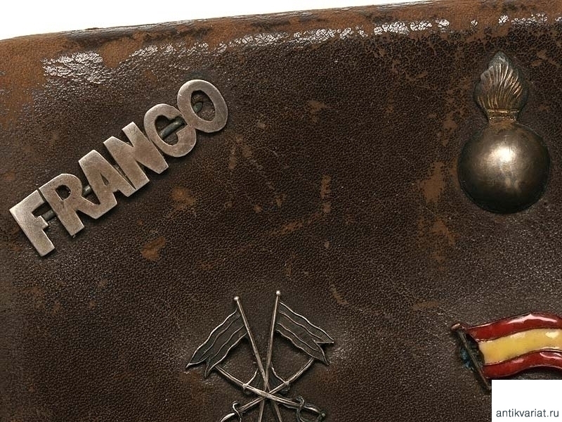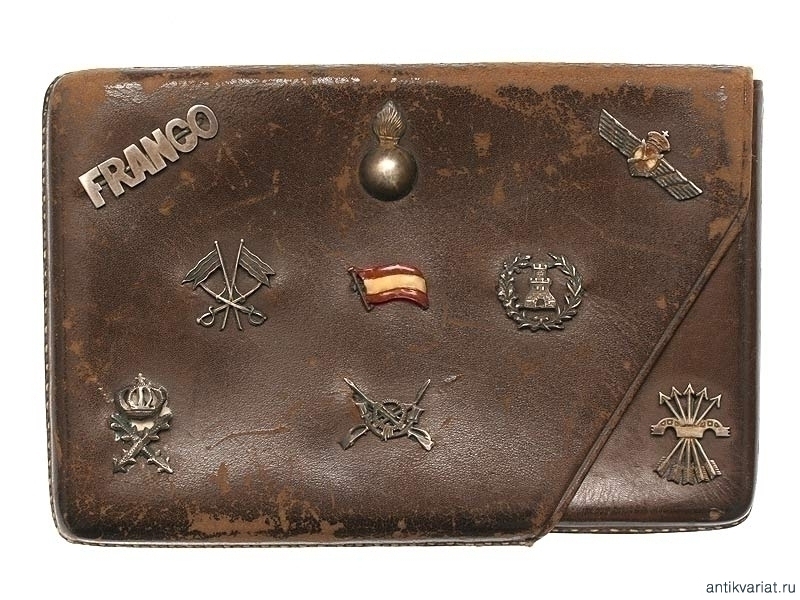 Кожаный портсигар, украшенный серебряными накладками на военную тематику. Среди накладок присутствуют фамилия Франко, летная эмблема, изображение гренады. Периода Второй мировой войны. Очень хорошее состояние.
