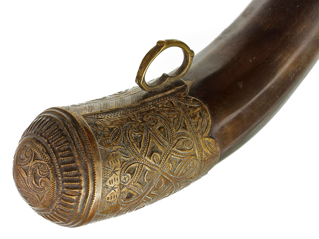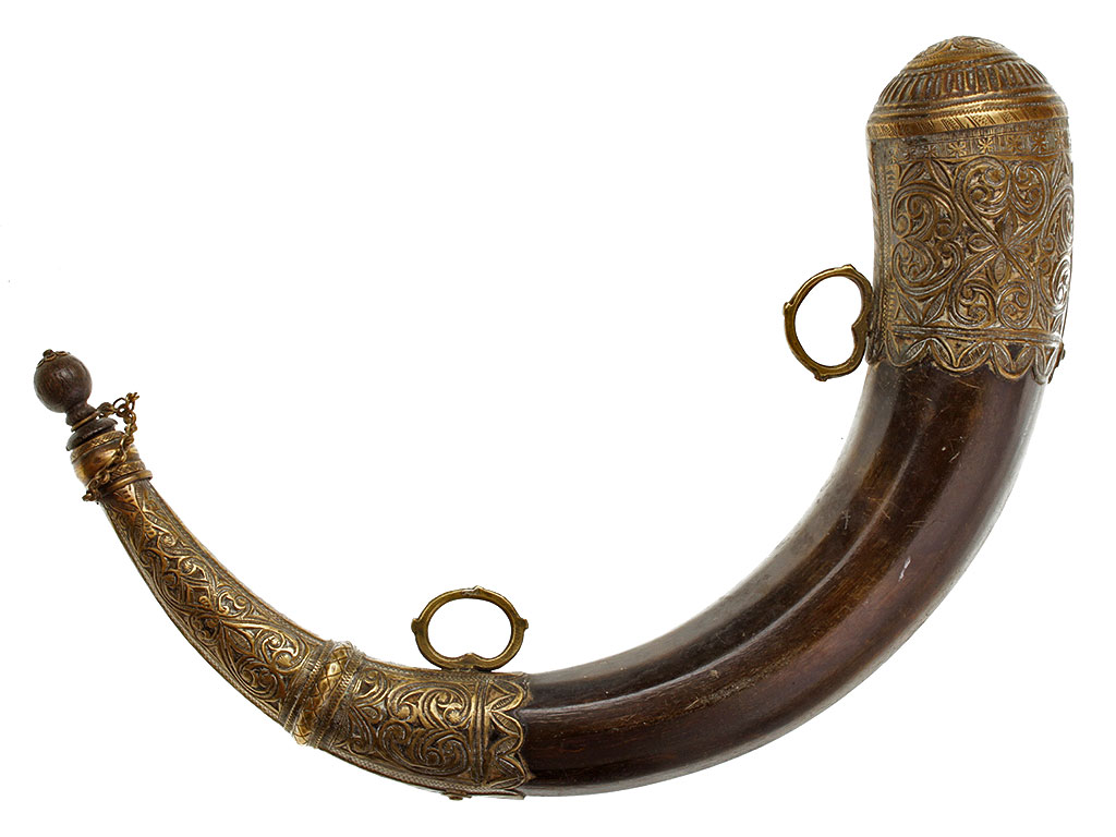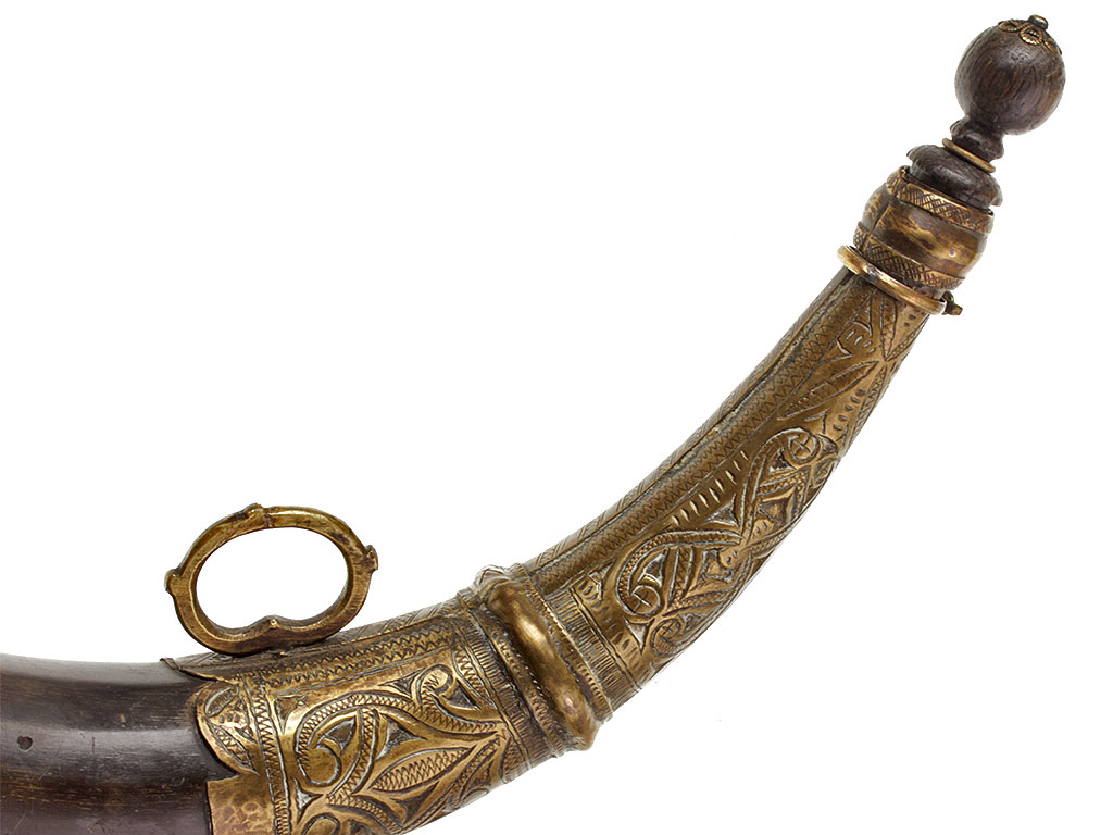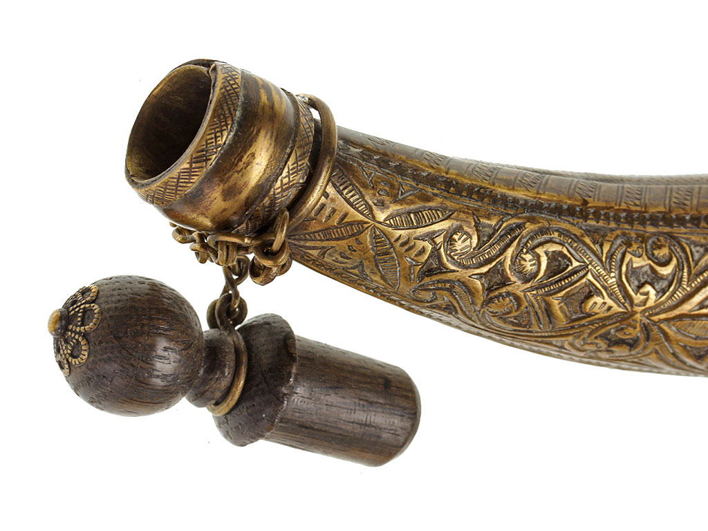 Пороховница турецкой работы для дымного пороха, предназначенная для заряжания капсюльного ружья. Изготовлена из рога с латунной окантовкой, украшенной гравированным геометрическим орнаментом. Середина XIX века.