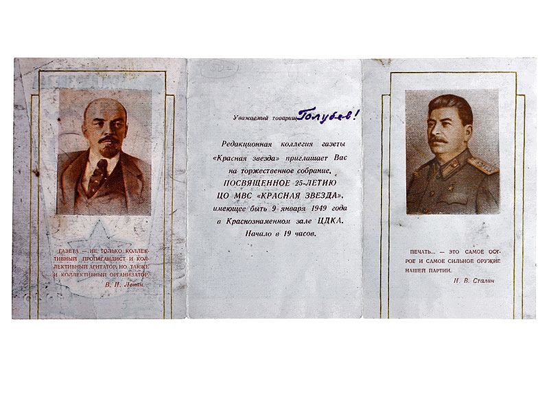 Поздравление и приглашение на торжественное собрание, посвященное 25-летию газеты "Красная звезда". Датировано 9 января 1949 года.