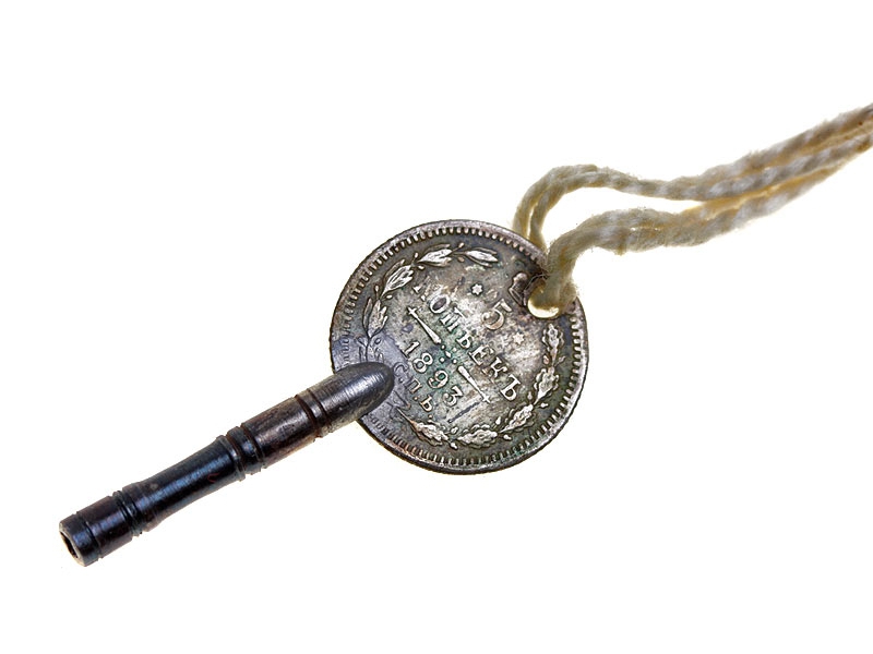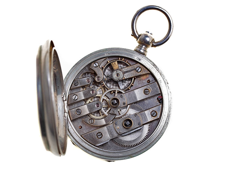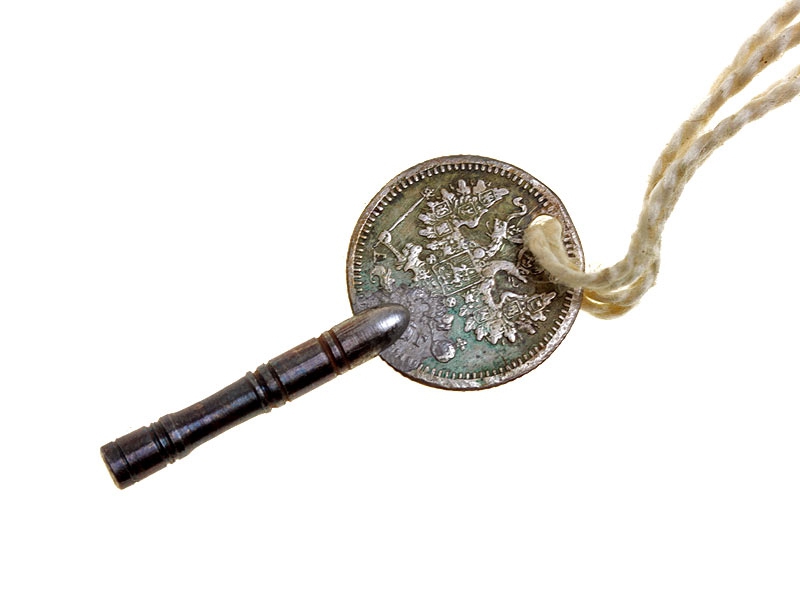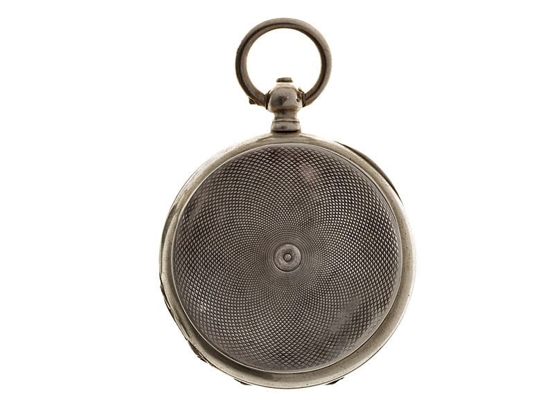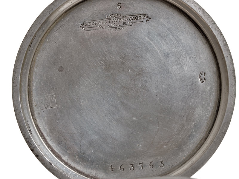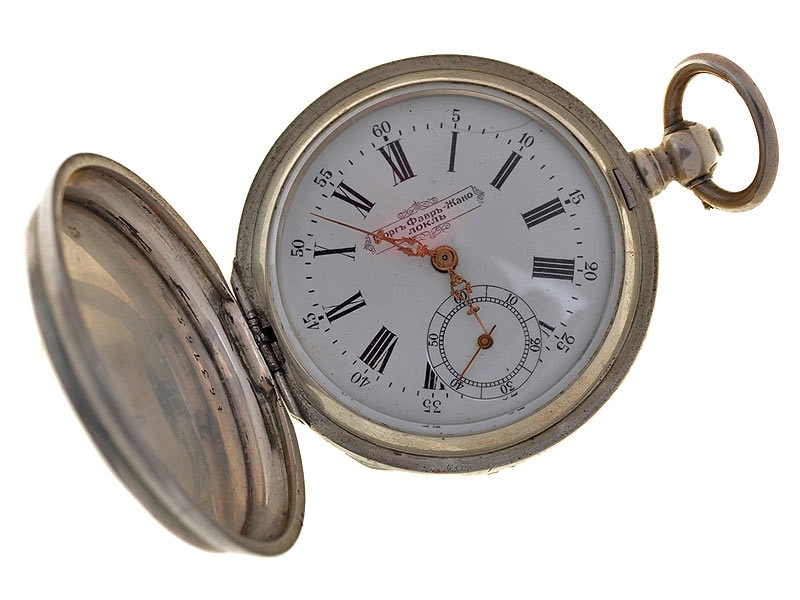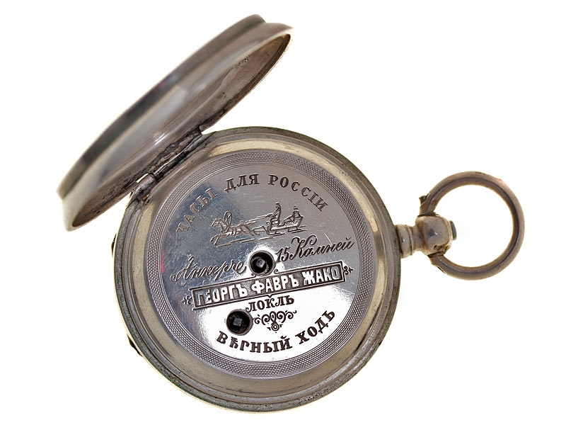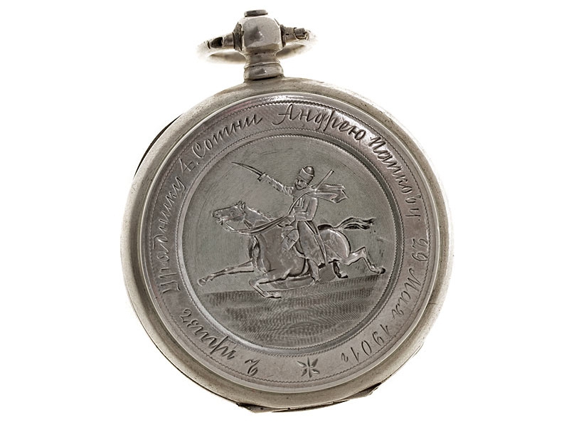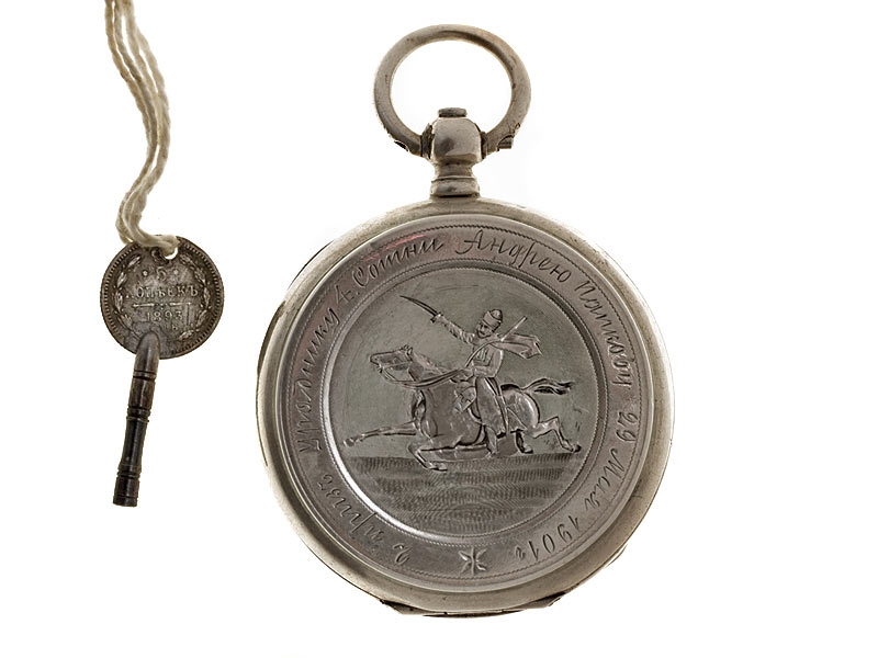 Призовые карманные часы в массивном серебряном трехкрышечном корпусе. В центре крышки с лицевой стороны - гравированное изображение скачущего казака, обрамленное по кругу гравированной надписью: "2-й приз уряднику 4-й сотни Андрею Папкову 29 мая 1901 года". Гравировка прекрасно сохранилась, изображение практически не затерто. Название полка, к сожалению, не указано, но необходимо отметить крайне редкий вариант нанесения наградной надписи на внешнюю поверхность крышки часов (как правило, надпись гравировалась внутри крышки). Белый фарфоровый циферблат с надписью "Георг Фавр-Жако Локль" без сколов и трещин, стрелки оригинально установлены. Механизм на ходу, с ключевым заводом. На внутренней крышке - стандартная для этой фирмы надпись "Часы для России. Георг Фавр Жако, Локль. Анкер 15 камней, верный ход". Внутренняя крышка также имеет два отверстия для ключа - одно служит для завода механизма, другое - для перевода стрелок. Ключ самодельный, входит в комплект; при его изготовлении использована серебряная монетка достоинством в 5 копеек 1893 года чеканки.