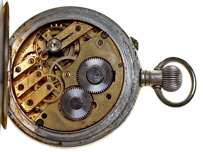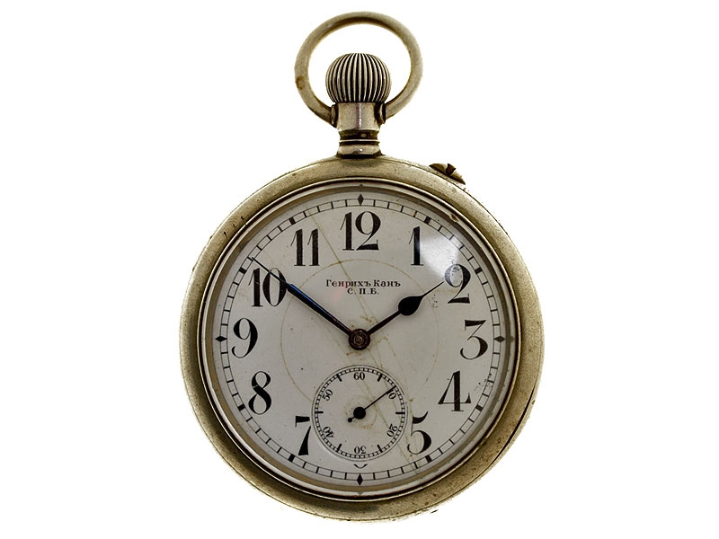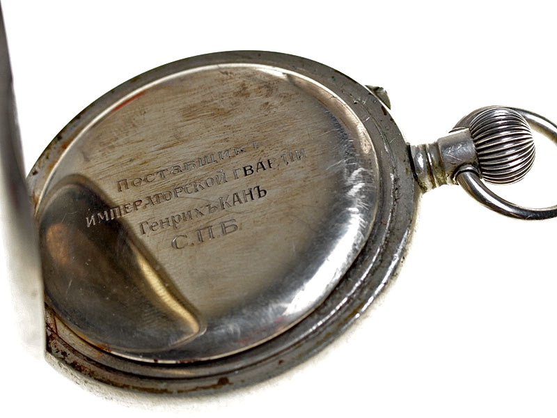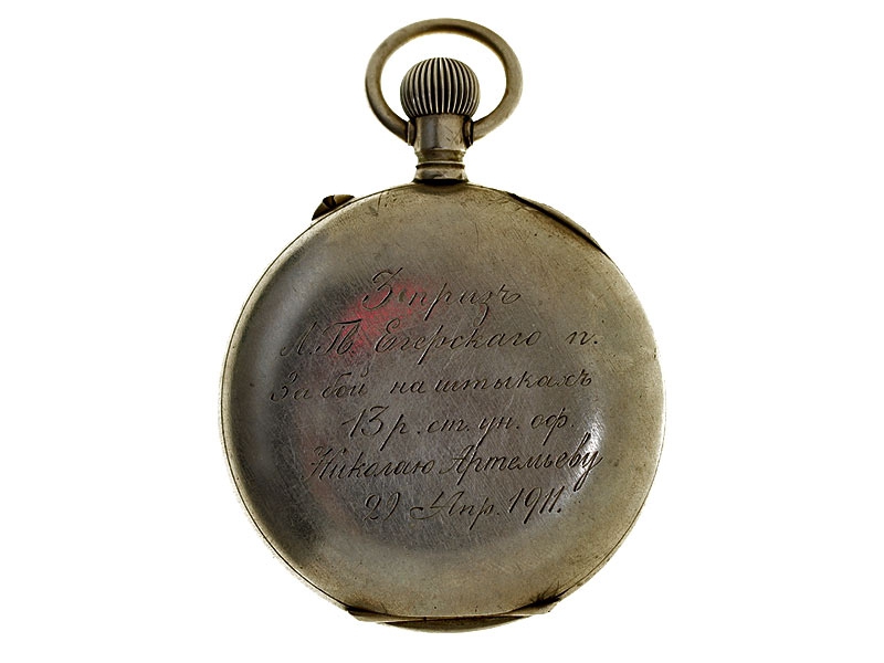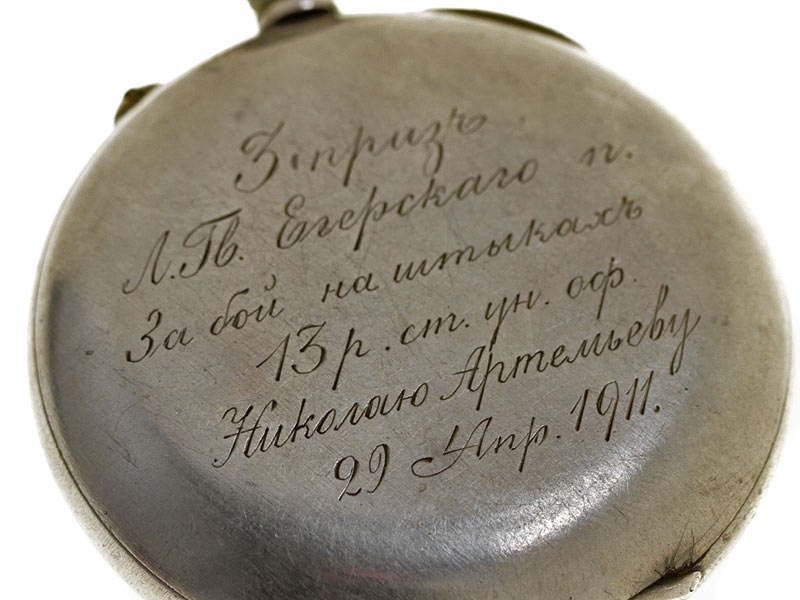 Призовые карманные часы "За бой на штыках" старшего унтер-офицера Лейб-гвардии Егерского полка Николая Артемьева. Часы в мельхиоровом двухкрышечном корпусе, изготовлены фирмой "Генрихъ Канъ" в Санкт-Петербурге - поставщиком Императорской гвардии. На внешней стороне крышки имеется гравированная надпись: "3 призъ Л.Гв. Егерскаго п. За бой на штыкахъ 13 р. ст. ун. оф. Николаю Артемьеву. 29 апр. 1911.". Механизм на ходу, в целом очень хорошее состояние часов, оригинальные вороненые стрелки.