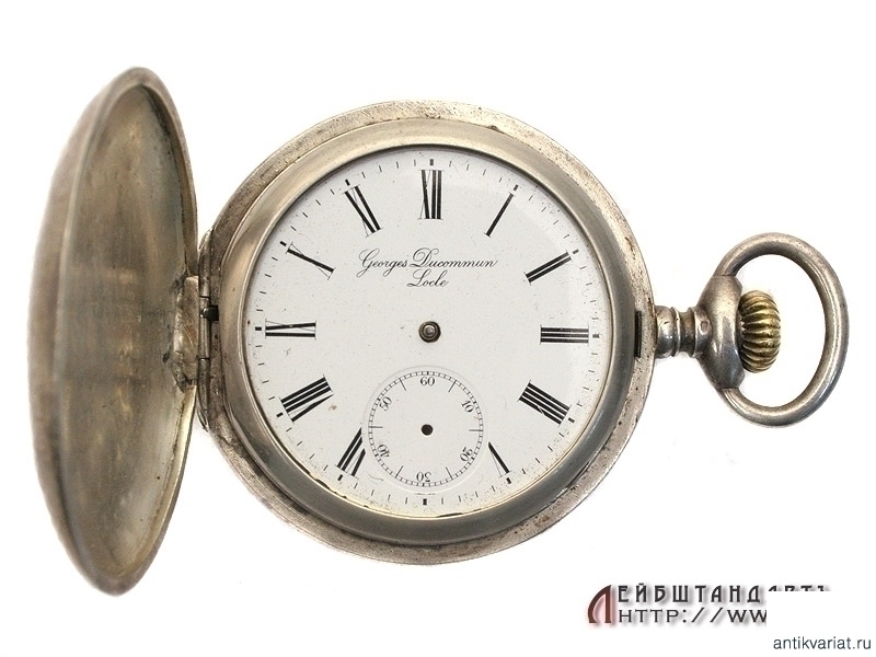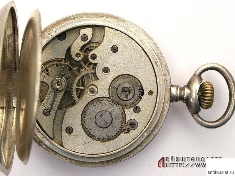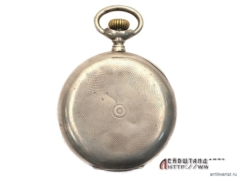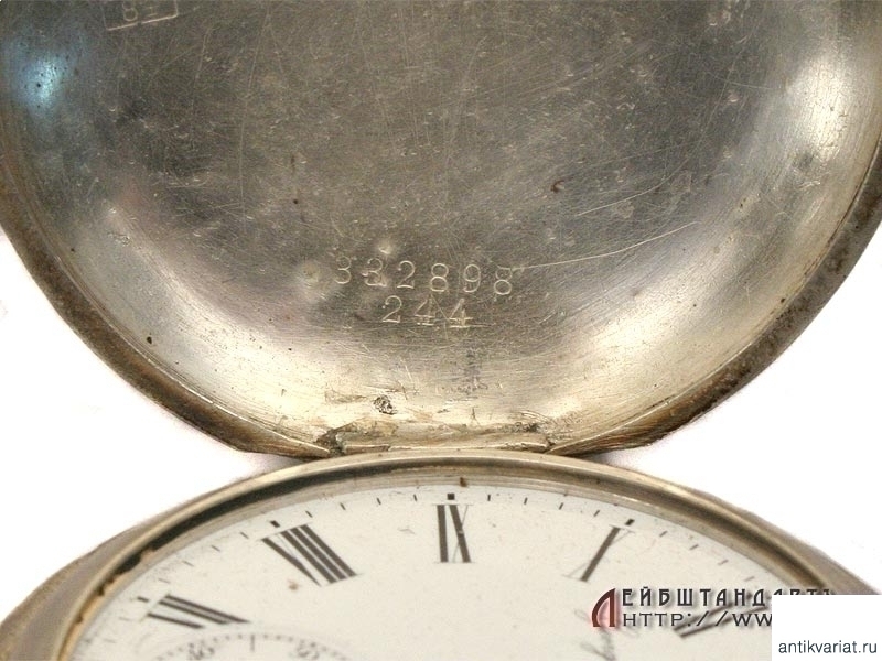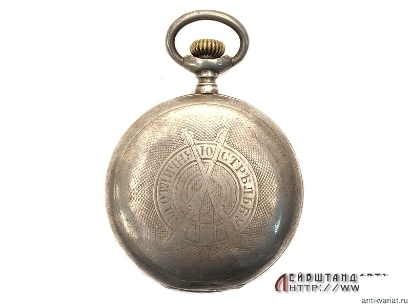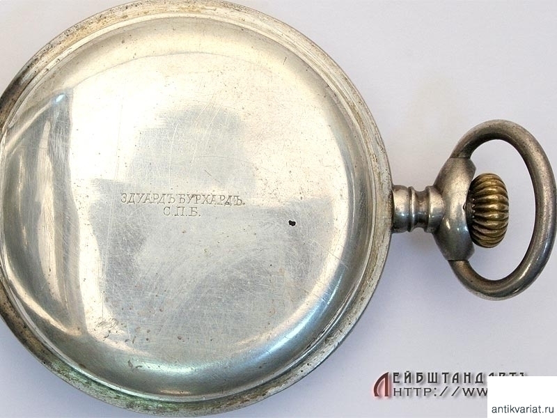 Призовые карманные часы, изготовленные в начале ХХ века фирмой "Эдуардъ Бурхардъ" в Санкт-Петербурге. На передней крышке оригинальная гравировка "За отличную стрельбу". Трехкрышечный корпус изготовлен из серебра 84 пробы, на внутренней крышке нанесено название фирмы. Механизм (к сожалению, не на ходу) подобран в более позднее время от подходящих по калибру карманных часов импортного производства.