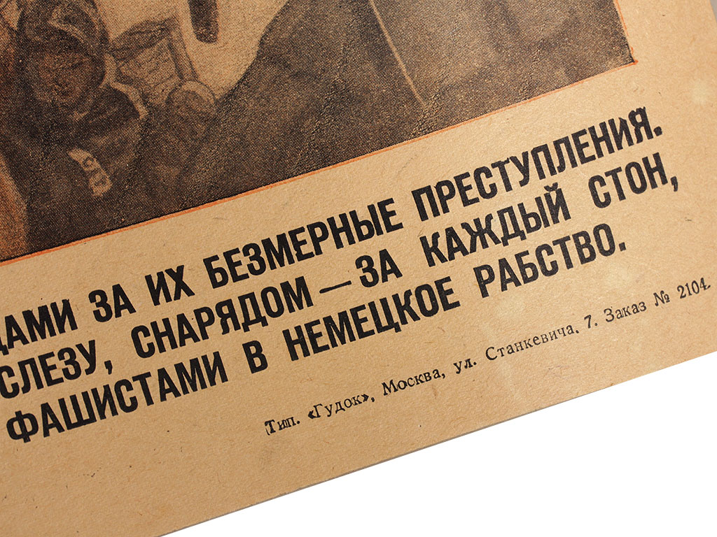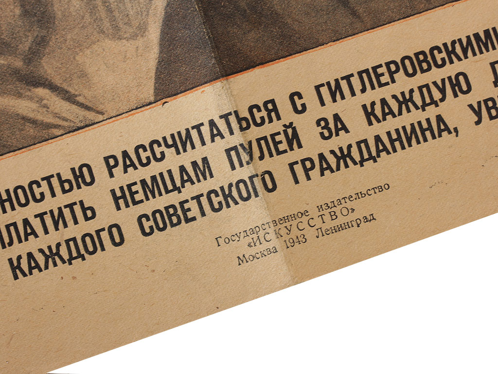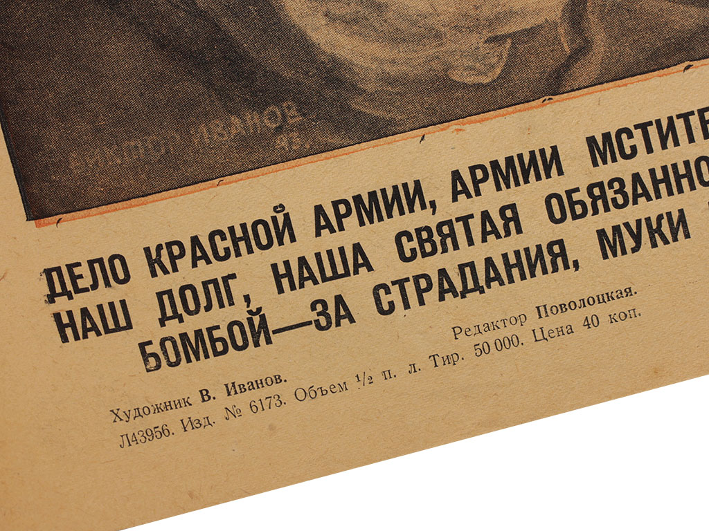 Агитационный плакат работы художника В.Иванова "Воин Красной Армии, выручи!" с текстом: "Дело Красной Армии, армии мстителей, - полностью рассчитаться с гитлеровскими людоедами за их безмерные преступления. Наш долг, наша святая обязанность - заплатить немцам пулей за каждую девичью слезу, снарядом - за каждый стон, бомбой - за страдания, муки и гибель каждого советского гражданина, увезенного фашистами в немецкое рабство.". Плакат подписан в печать в 1943 году и издан государственным издательством "Искусство", а отпечатан в типографии "Гудок" в Москве. Превосходное коллекционное состояние, на поле - чернильный штамп "Сигнальный экземпляр".