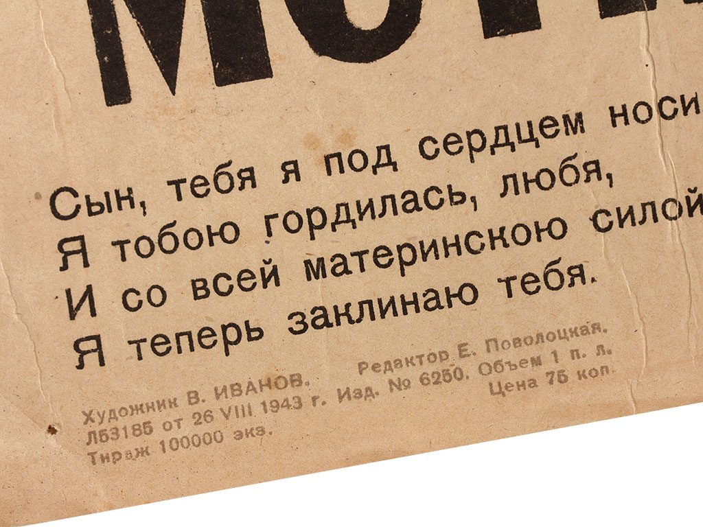 Агитационный плакат работы художника Виктора Иванова "Мсти за горе народа!" с текстом стихотворения Веры Инбер. Плакат подписан в печать 26 августа 1943 года и издан государственным издательством "Искусство", а отпечатан в типографии Госпланиздата. Отличное коллекционное состояние.