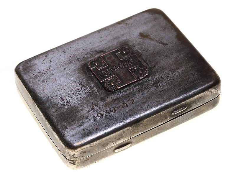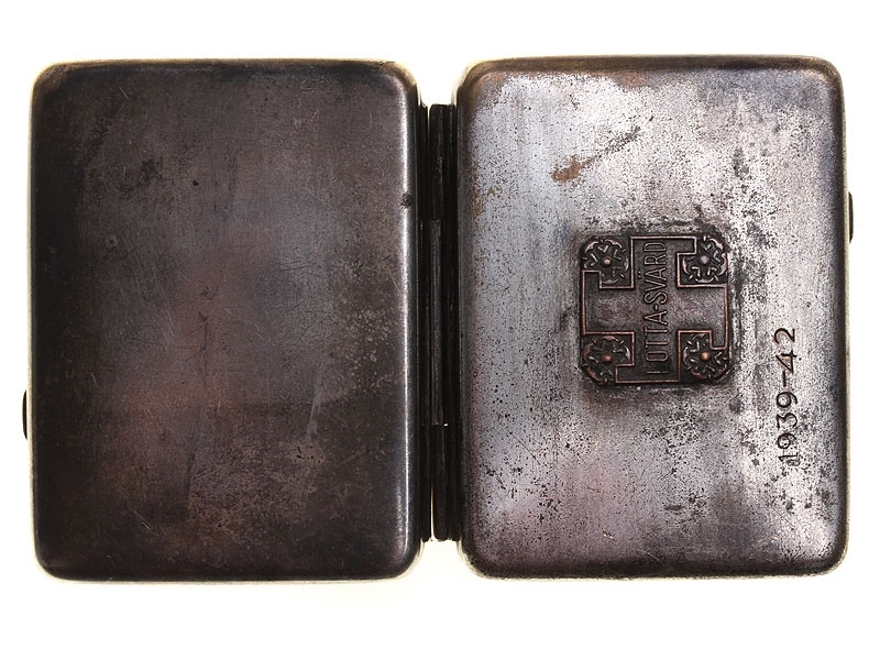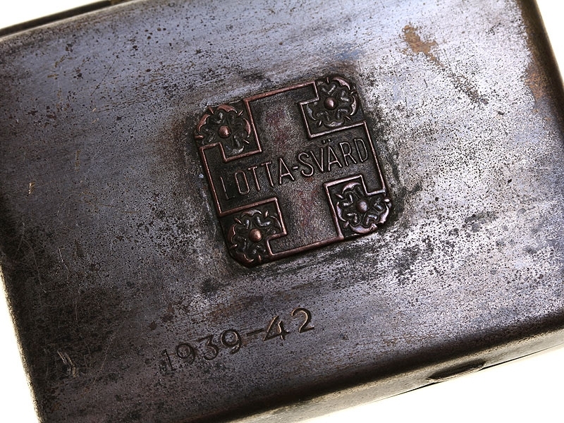 Металлическая коробочка (вероятнее всего, пудреница) с накладным значком члена добровольческой финской женской организации "Лотта-Свярд". Томпак, серебрение. На крышке штампом нанесена дата "1939 - 42".