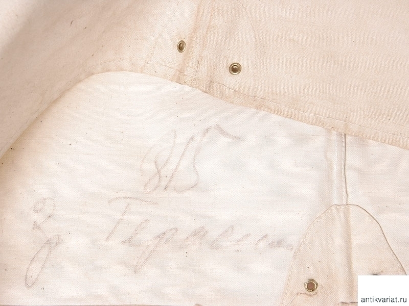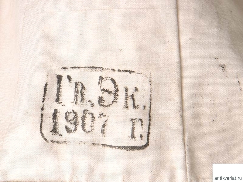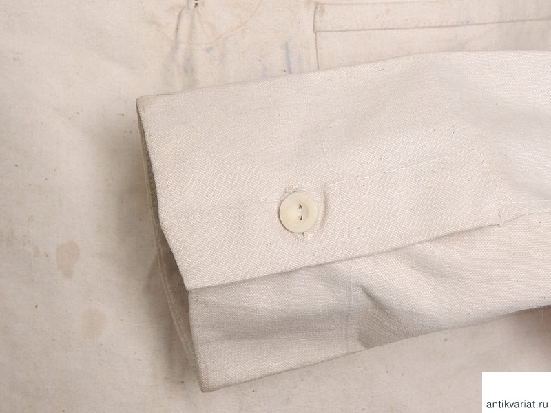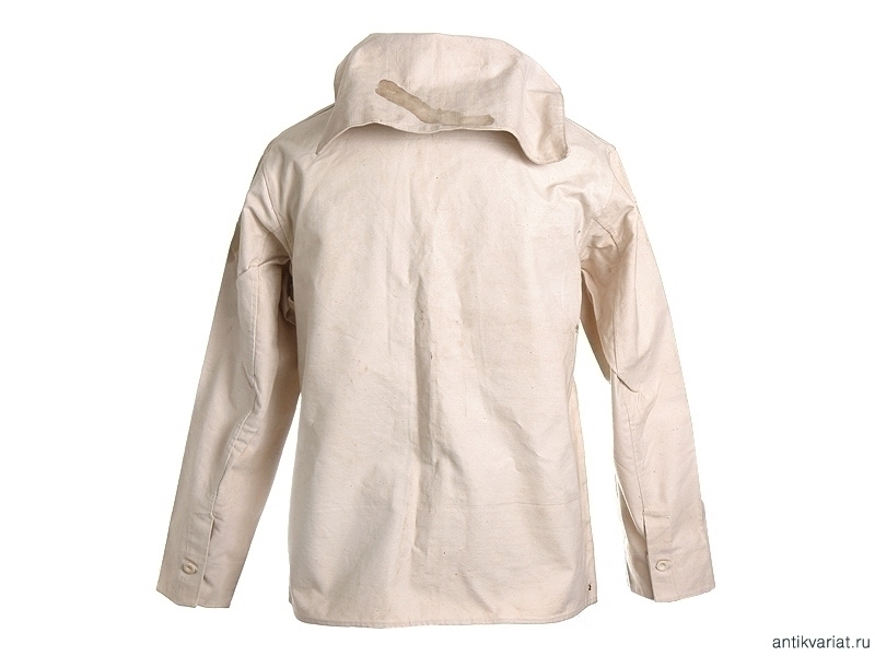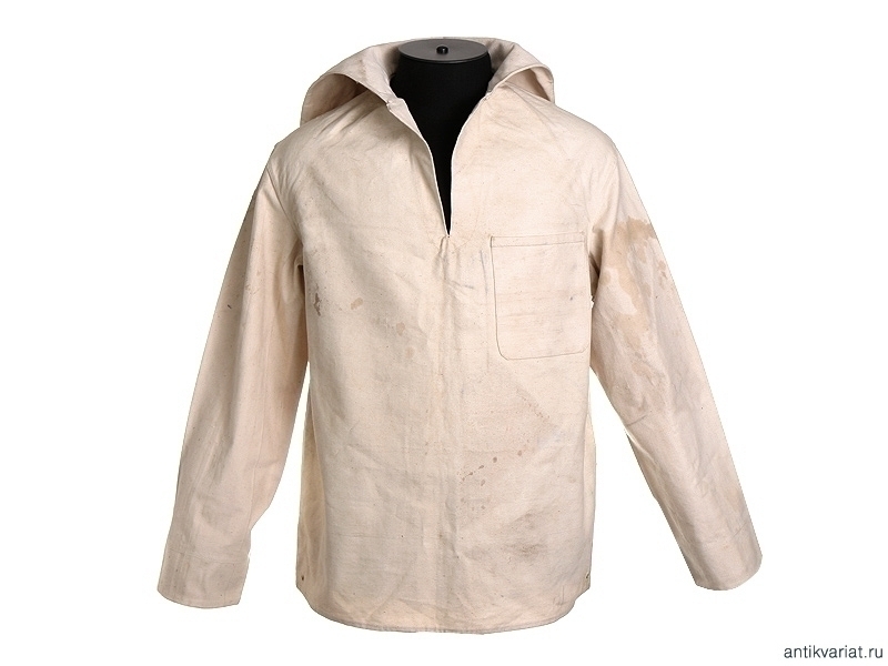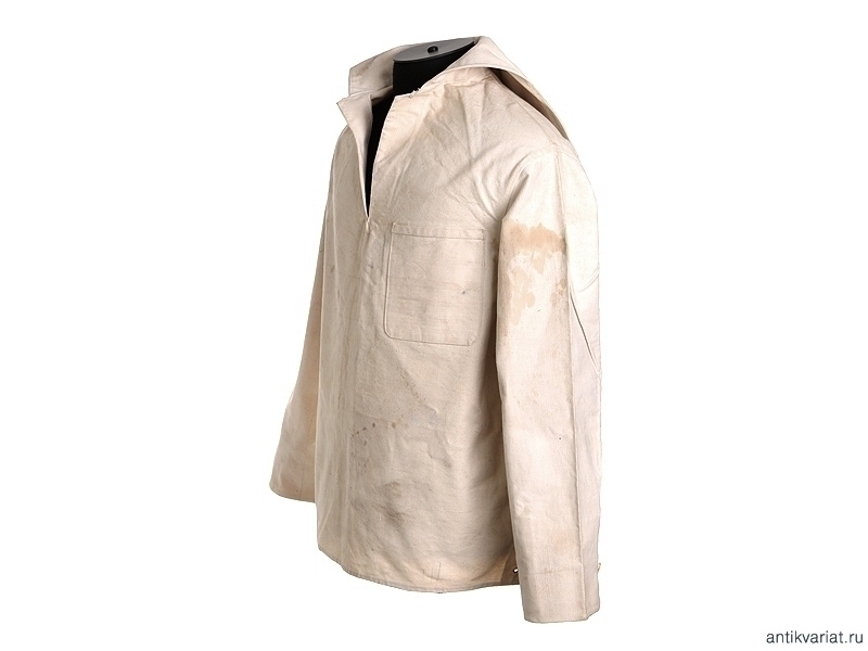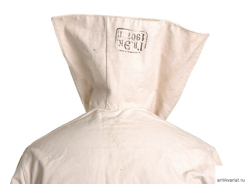 Рабочая роба матроса Гвардейского морского экипажа. Из белой накрахмаленной плотной ткани, фактически неношеная. Оригинально пришитые пуговицы и латунные люверсы. На внутренней стороне отложного воротника - штамп типографской краской: "Гв.Эк. 1907г." - Гвардейский морской экипаж, 1907 год. Размер примерно 50. На внутренней стороне химическим карандашом надписана фамилия владельца.