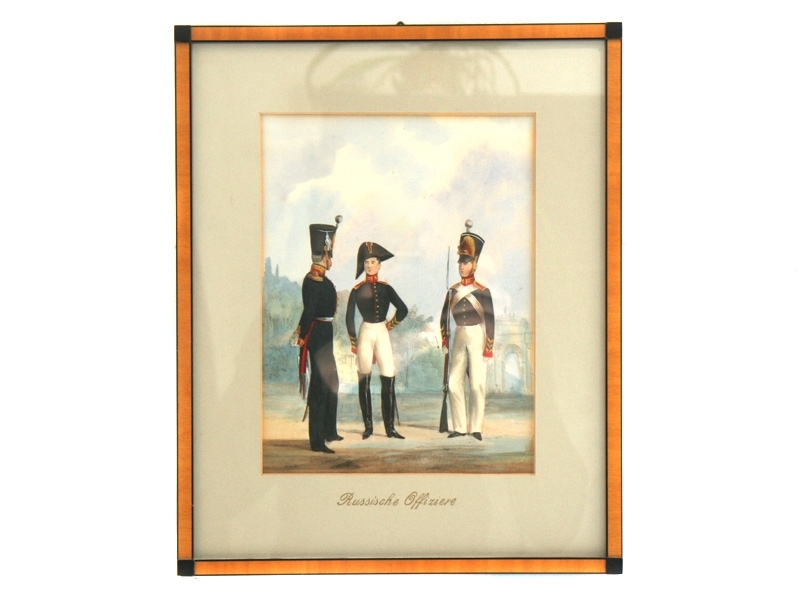 Раскрашенная литография, изображающая офицера и воспитанников Пажеского корпуса. Форма периода 1830-х годов. В застекленной рамке из шпонированного багета.