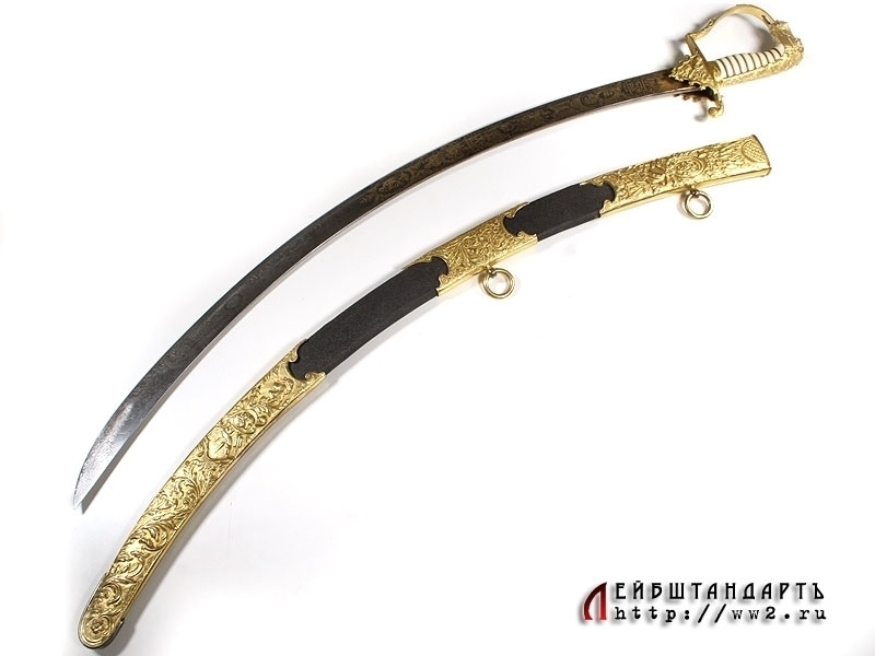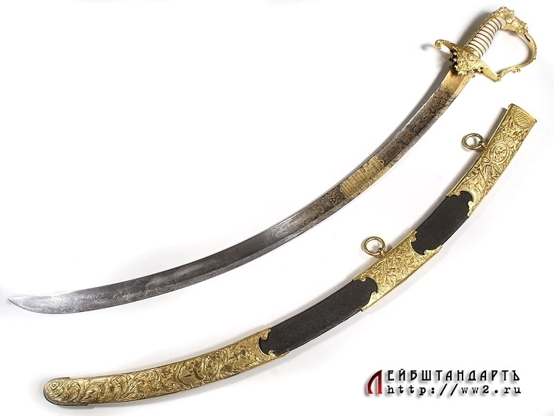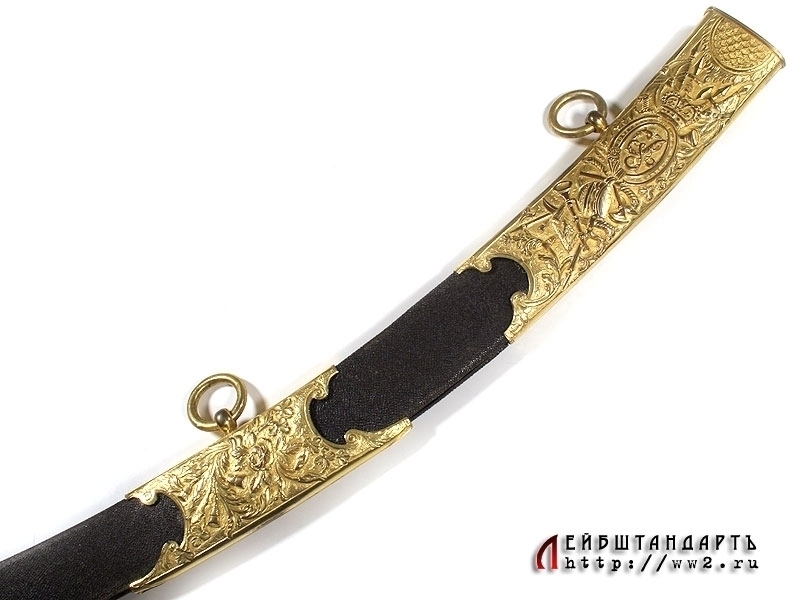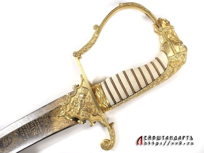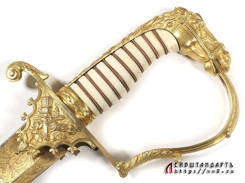 Эфес состоит из рукояти и бронзовой гарды. Рукоять из высококачественной слоновой кости с насечкой, обмотана по поперечным желобкам витой проволокой разных диаметров. Гарда образована спинкой и передней дужкой, отходящей от верхней части рукояти и плавно переходящей в крестовину, конец которой слегка загнут вниз и закруглен. Навершие трактовано в виде лошадиной головы, рельефно проработанная грива украшает собой спинку рукояти. Дужка снабжена закрывающим основание клинка декоративным щитком, украшенным в стиле «ампир» рельефными изображениями военной арматуры. Все бронзовые части эфеса покрыты оригинальным «огненным» золочением, сохранившимся практически полностью.