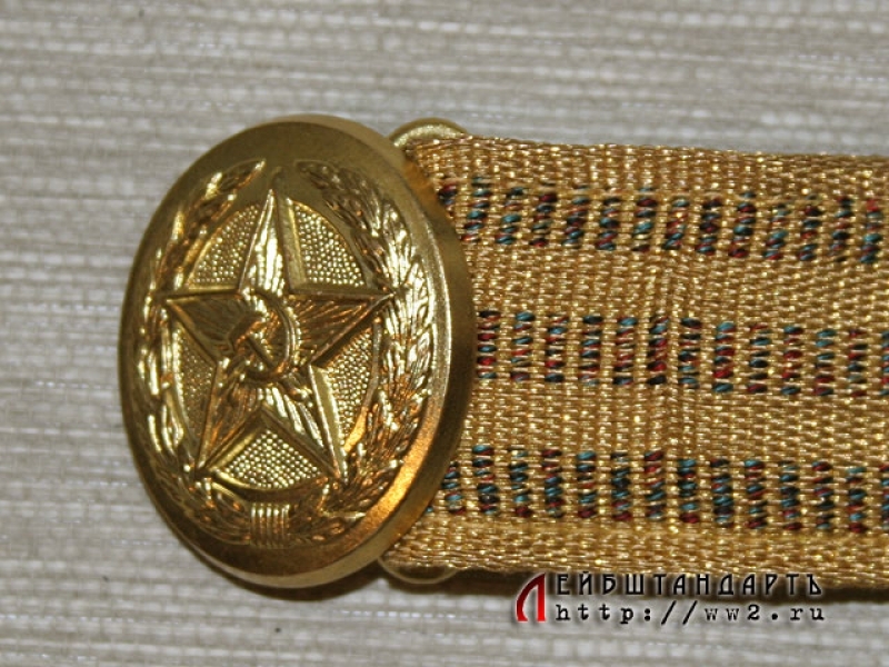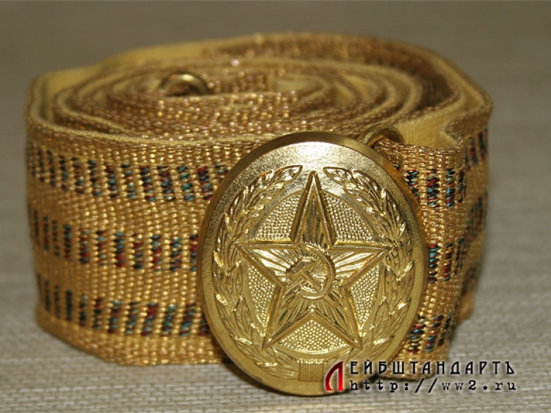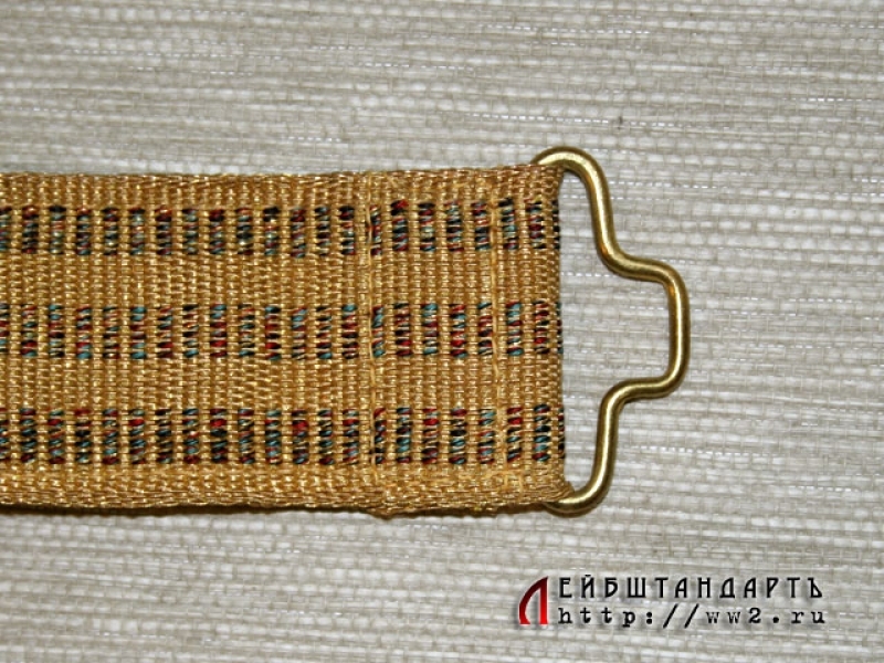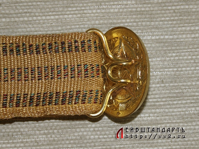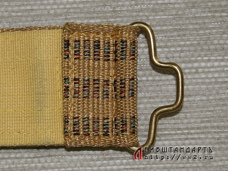 Парадный офицерский ремень, плетеный машинным способом из металлизированной нити на желтой тканевой подложке. Овальная латунная пряжка, рамочный зацеп. Ремень достаточно большой длины, в отличном состоянии.