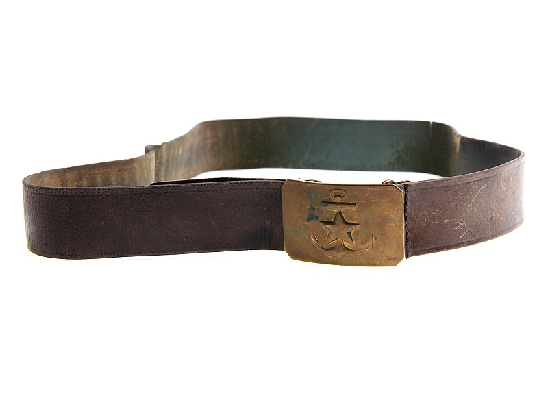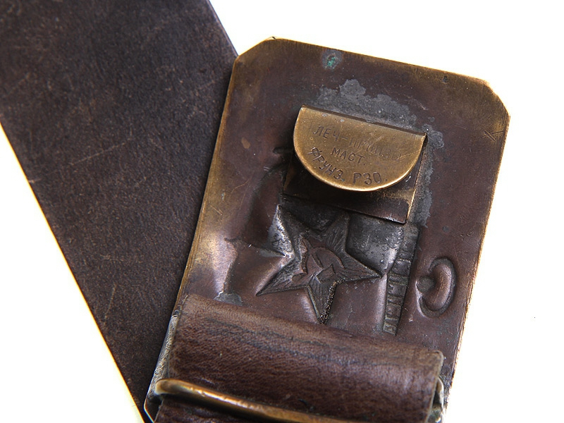Ремень рядового состава РККФ с латунной пряжкой, на зацепе которой имеется клеймо "Леч-произв.Маст.Фрунз.РЗО". Периода Второй мировой войны. Полотно ремня в средней степени сохранности, использовалось для правки бритв.