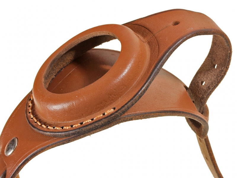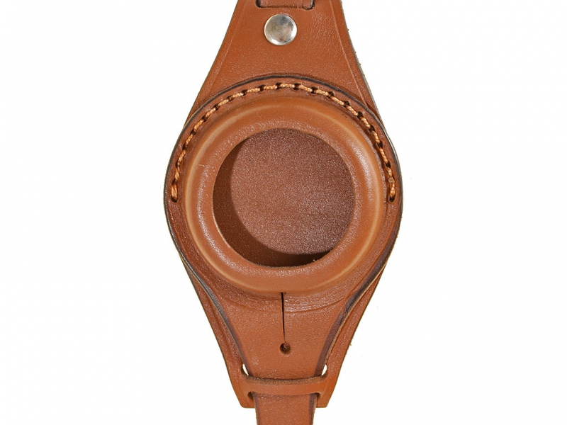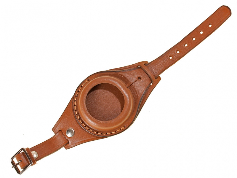 Кожаный ремешок для часов в корпусе диаметром 50 мм, вариант 1, Россия, СССР. В то время, когда карманные часы были распространены гораздо шире наручных, такие ремешки использовали для ношения карманных часов на руке. Наручные часы входят в употребление во время Первой мировой войны: изначально для наручного ношения либо переделывали корпус часов (удаляя бигель и припаивая ушки), либо пользовались ремешком, аналогичным представленному.