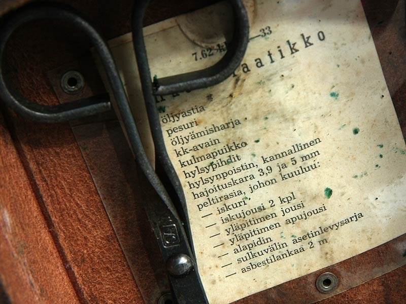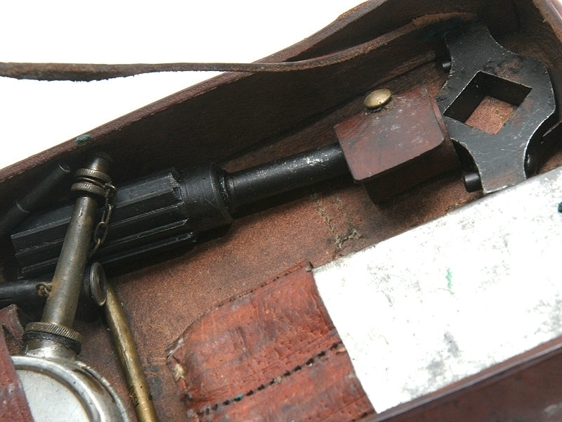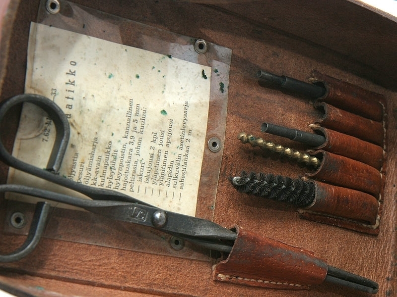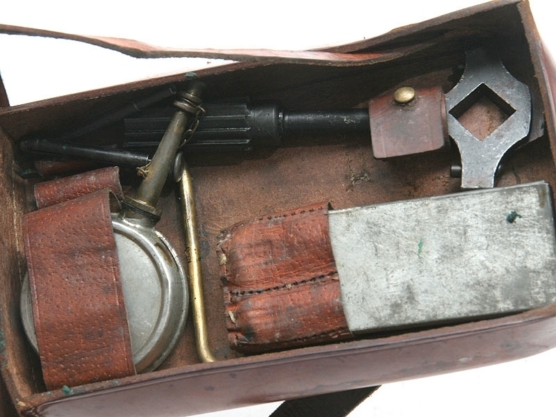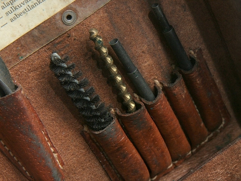 Ремонтный комплект к станковому пулемету системы Максим финского производства. Включает в себя различные протирки для чистки затвора и ствола, отвертки, масленку. Все помещено в оригинальный кожаный футляр, многие предметы маркированы клеймом финской армии "SA".
