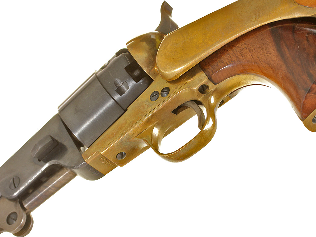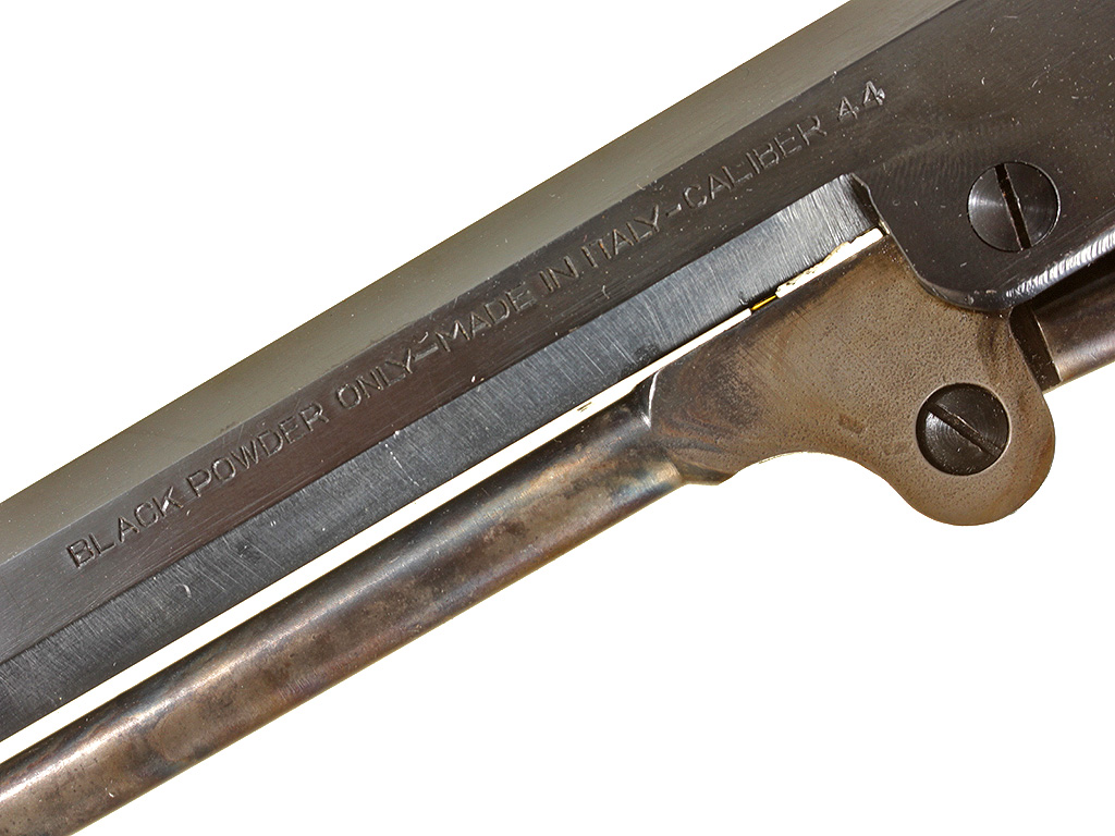 Капсюльный револьвер системы Кольта (практически копирующий модель "Кольт Нэви" (Colt Navy) - продукция компании "Armi San Paolo". Представляет собой классический 6-зарядный револьвер 44-го калибра. На боковой плоскости удлиненного восьмигранного ствола хорошо читаемые клейма ".44 Cal. Made in Italy / For black powder only". Оригинальные деревянные щечки рукояти, револьвер в отличной сохранности. В комплекте со съемным прикладом.