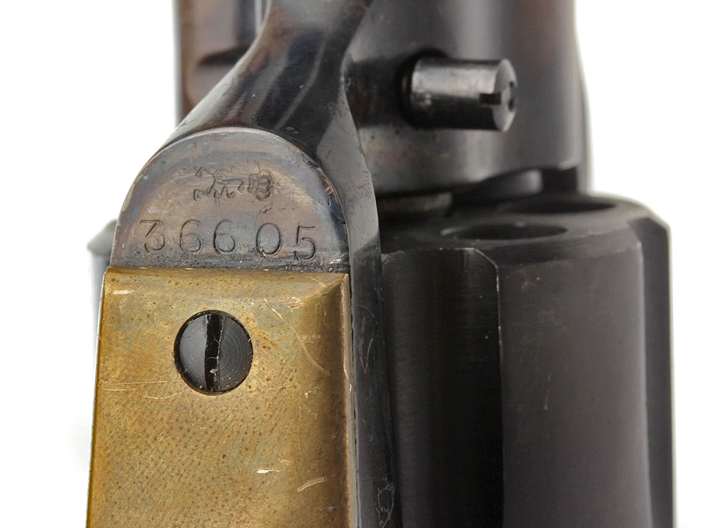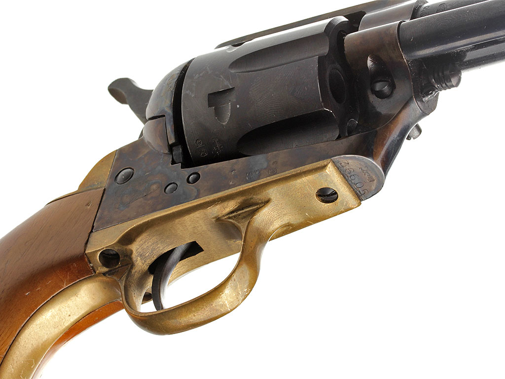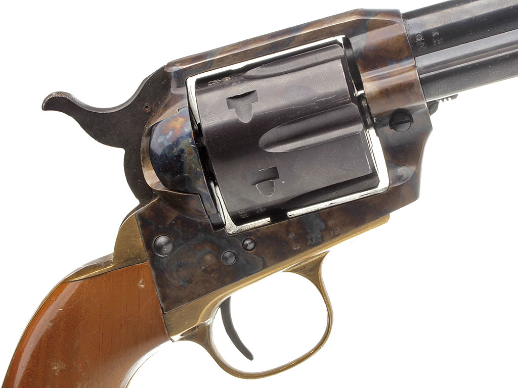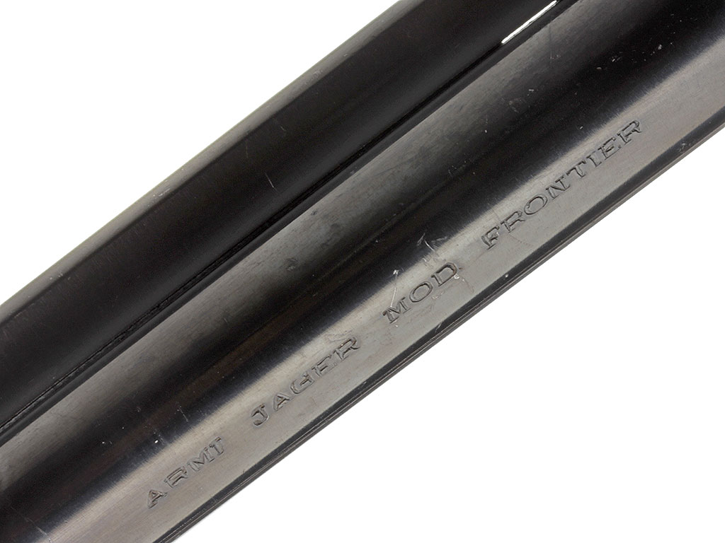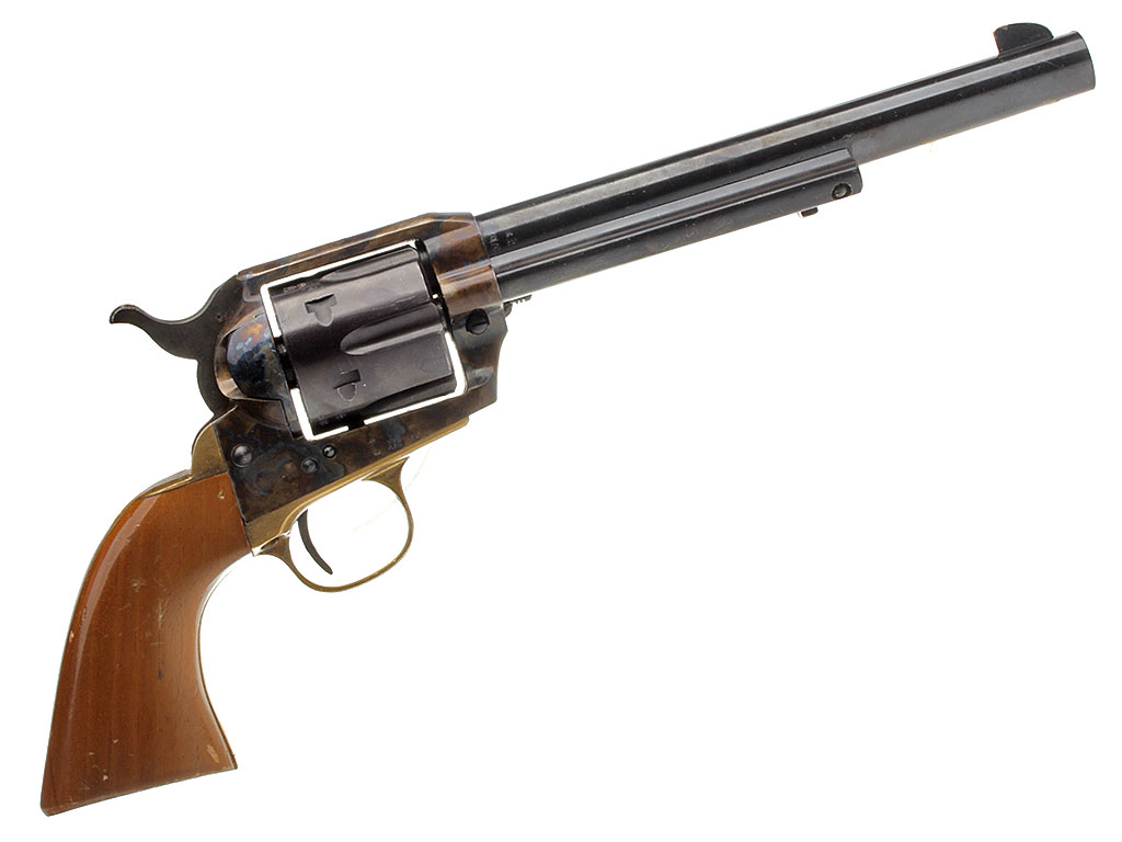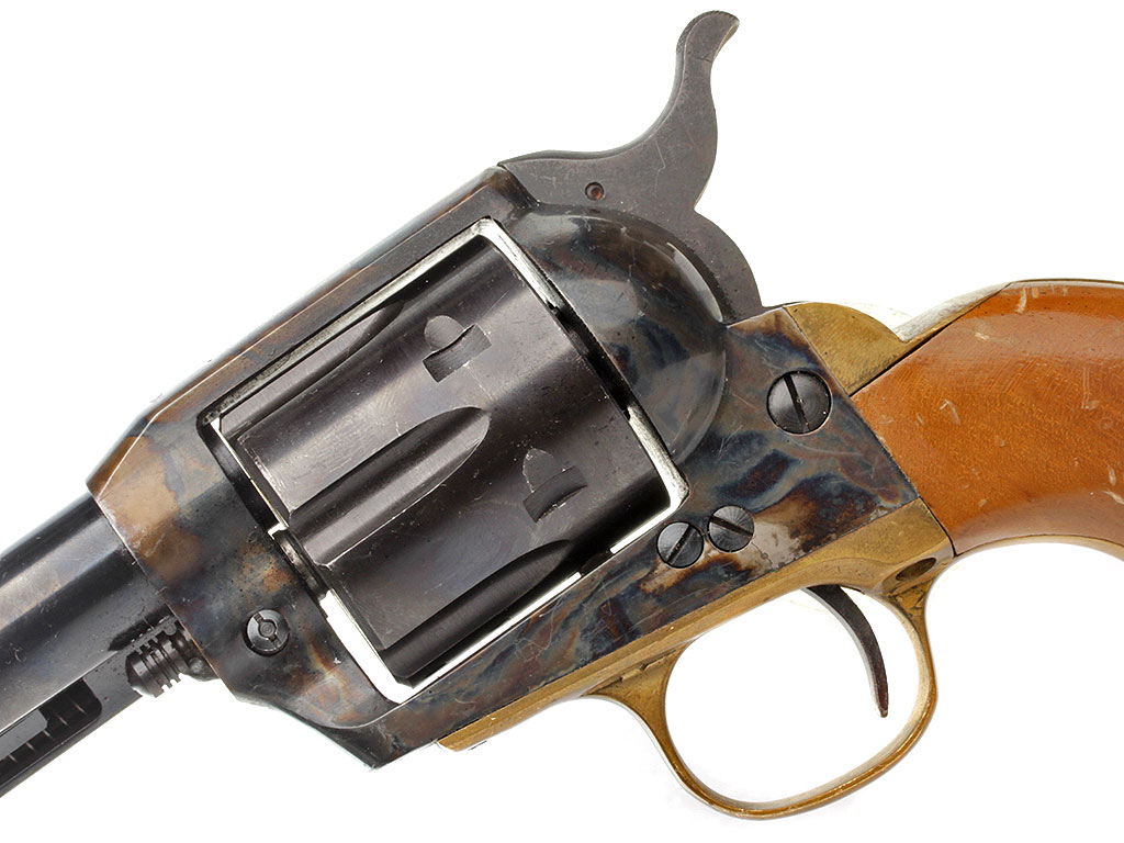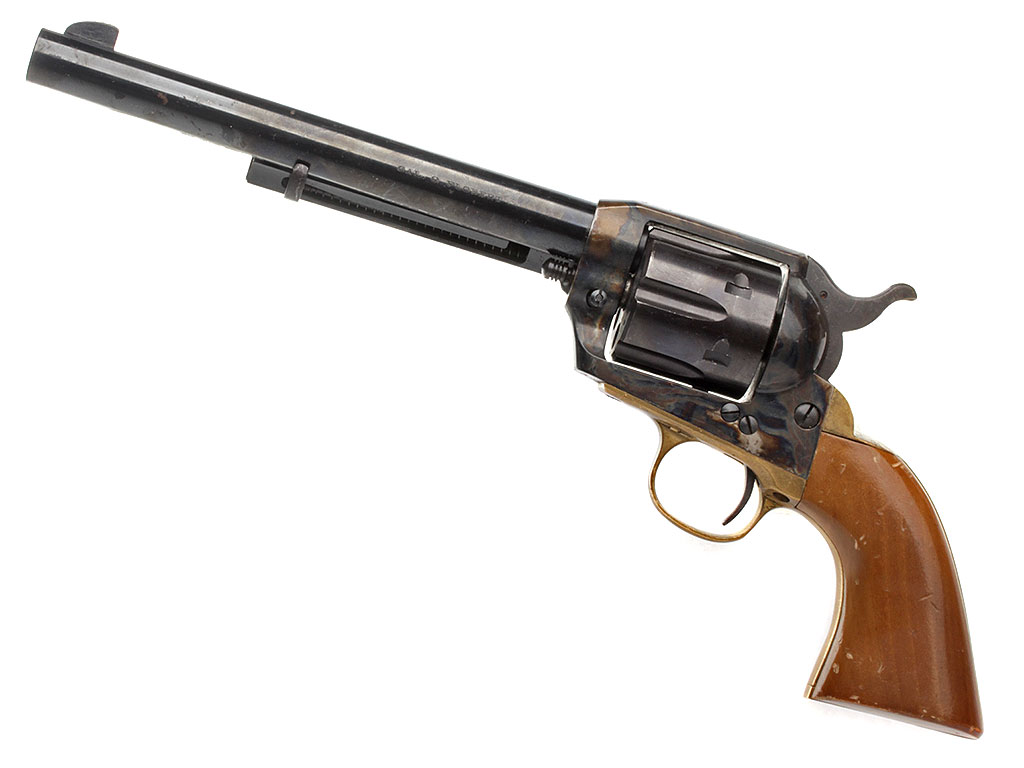 Изготовленный в 1980-е годы револьвер "Dakota Armi Jager" (с механизмом одинарного действия) калибром "9 Flobert". В представленном варианте установлен стандартный ствол длиной 172 мм. Все стальные части имеют высококачественную отделку и покрыты красивым полированным воронением, скоба изготовлена из латуни, щечки рукояти - из орехового дерева.