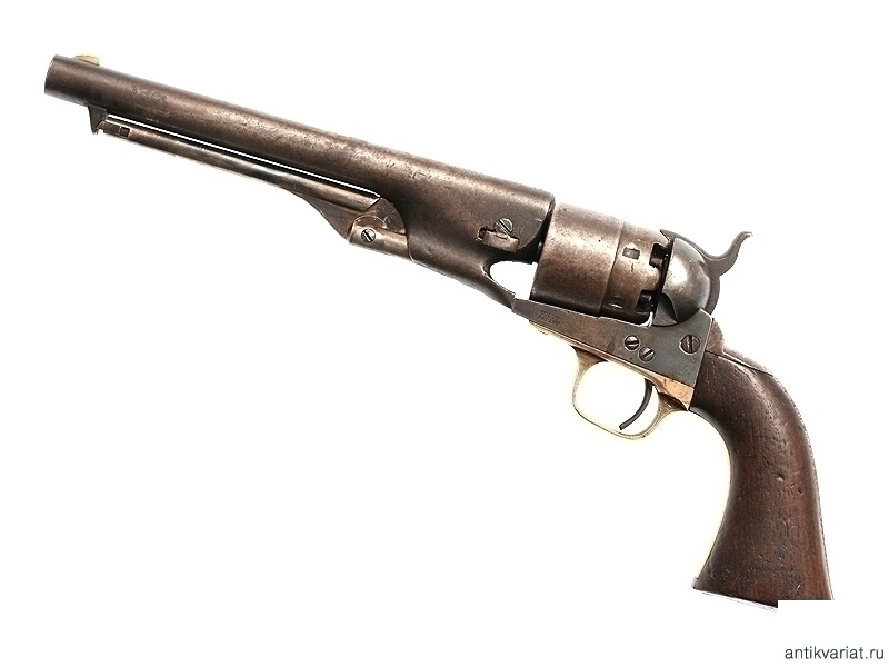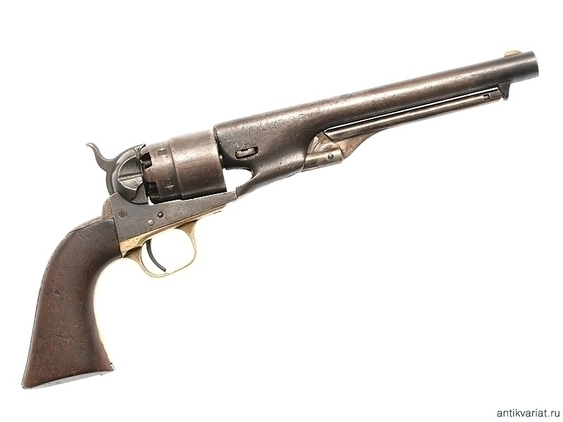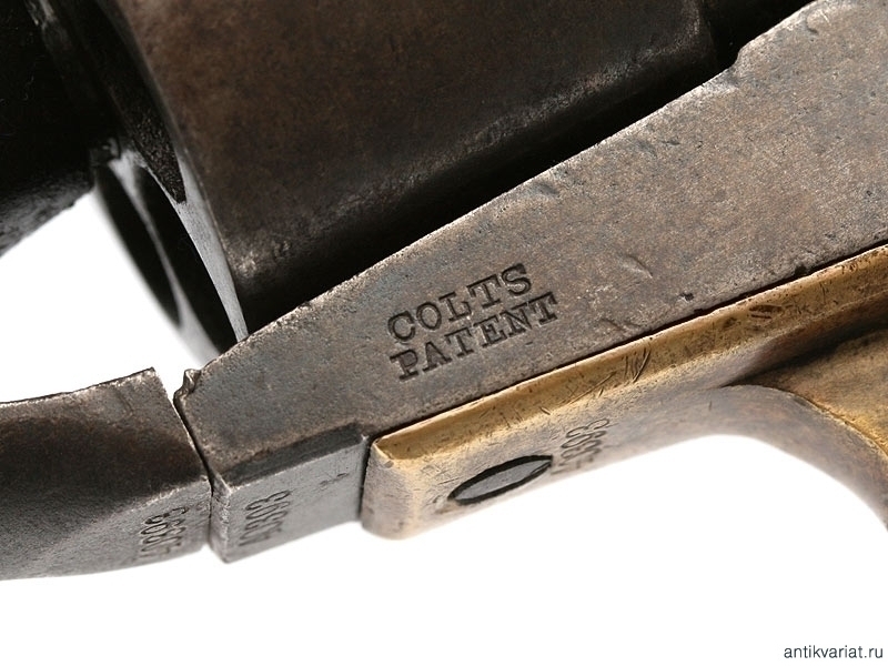 Капсульный шестизарядный револьвер системы Кольта выпуска середины XIX века. Корпус в оригинальном воронении, незначительно вытертом, скоба изготовлена из латуни. Все номера совпадают, револьвер полностью исправен.