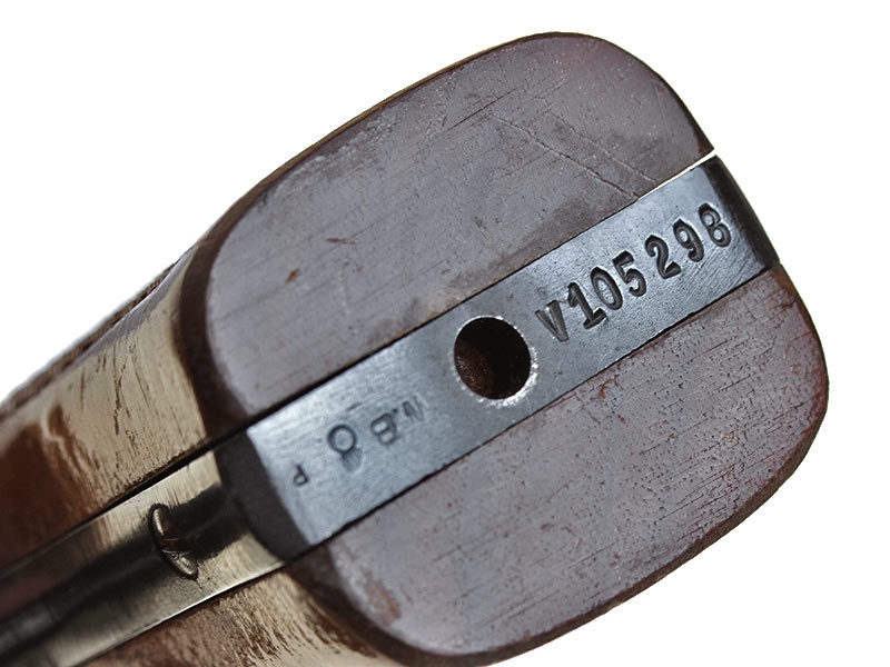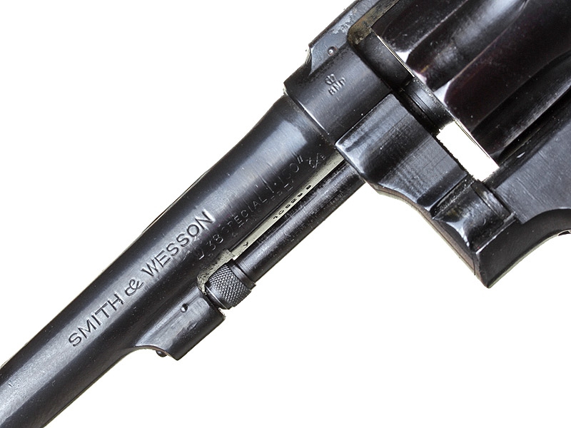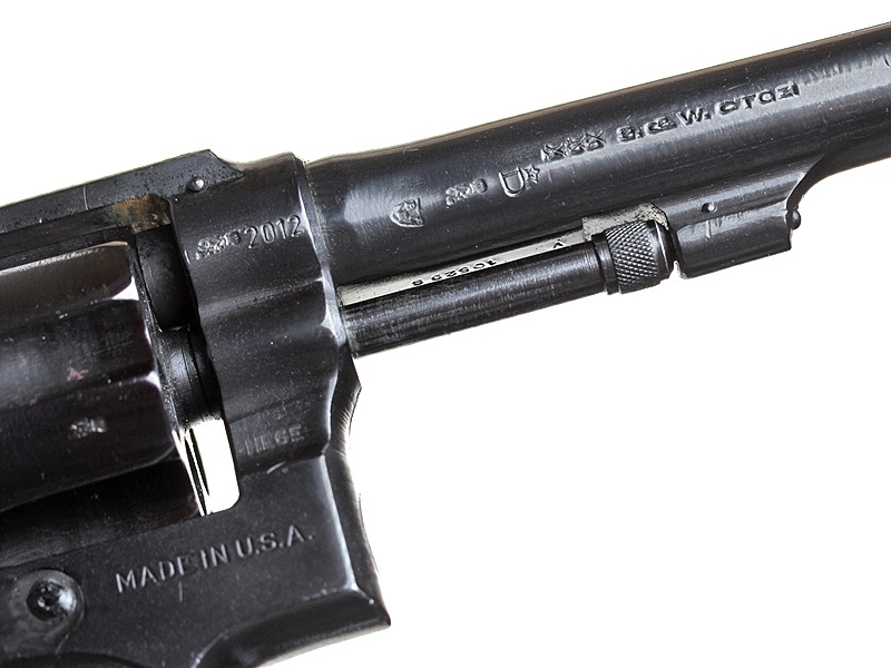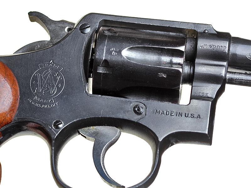 Револьвер, изготовленный фирмой Смит и Вессон, модель "Military & Police". Изготовлен в годы Второй мировой войны, о чем свидетельствует буква "V" перед серийным номером. Отличное состояние, оригинальное воронение.