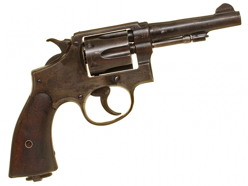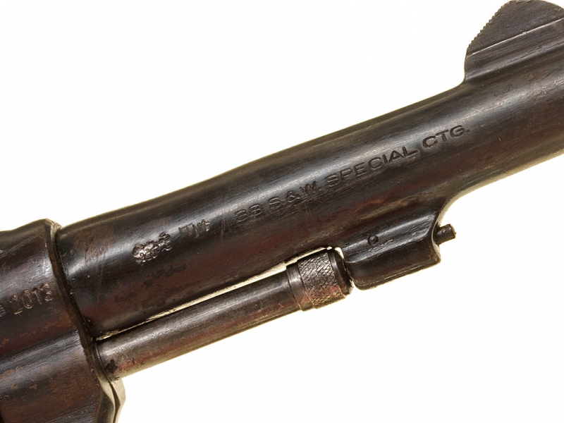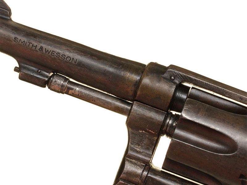 Револьвер, изготовленный фирмой Смит и Вессон, модель "Military & Police". Изготовлен в годы Второй мировой войны под патрон 38.Special и использовался в американской армии: на рамке имеется маркировка "H.D." (клеймо военного инспектора Guy H. Drewry - подполковника американской армии, бывшего военным инспектором в том числе и по продукции компании "Smith & Wesson"). В целом хорошее состояние, переворонен.