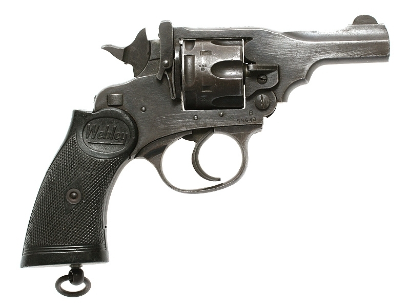 Револьверы с "переламывающейся" для перезарядки рамкой английская фирма Webley & Son company (Webley & Scott Co. с 1897 года) начала производить в 1870х годах. В 1887 году револьвер системы Веблей-Грин (Грин - конструктор узла запирания) был принят на вооружение Британской армии, и с этого момента и вплоть до 1932 года (а де факто - вплоть до конца Второй Мировой Войны) револьверы Webley с перломной рамкой являлись основным короткоствольным оружием солдат и офицеров Британской империи, и были заменены сперва револьверами Энфильд, а затем - пистолетами Browning High Power. Следует отметить, что британцы последними отказались от револьверов с переломной рамкой. Такая схема, достаточно популярная во второй полвине XIX века, обеспечивает достаточно высокую скорость перезарядки, сравнимую с таковой для револьверов с откидывающимся вбок барабаном, однако "переломная" рамка, по сравнению с цельной того же размера и веса, сложнее в изготовлении и имеет меньшую прочность. Кроме того, такая схема критична к прочности и степени износа замка рамки. Поэтому неудивительно, что британцы использовали в своих "переломных" револьверах в основном сравнительно маломощные патроны .45 и .38 калибров (патрон .455 Бритиш имел пулю массой 17.7 грамма с начальной скоростью всего около 180 м/с, что обеспечивает дульную энергию всего лишь в 288 Джоулей; патрон .38/200 разгоняет пулю весом 13.6 грамма всего до 190-195 м/с, развивая дульную энергию около 250 Джоулей, что существено меньше, чем у других патронов аналогичного калибра - например, патрон .45АСР генерирует дульную энергию примерно 400 - 500 Джоулей, .38 Special - порядка 300-350 Джоулей, 9х19мм Парабеллум - 500-600 Джоулей). С другой стороны, ряд поздних револьверов Webley успешно перестволивали под патроны .45АСР (с использованием плоских обойм на 3 патрона).