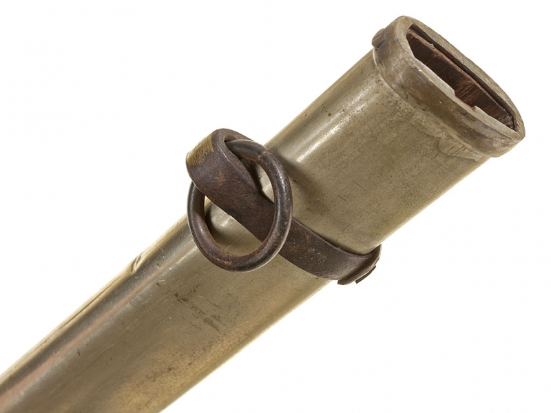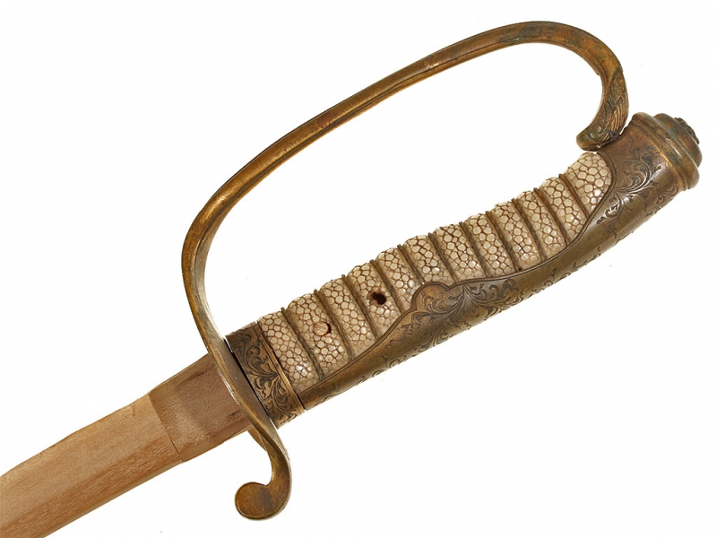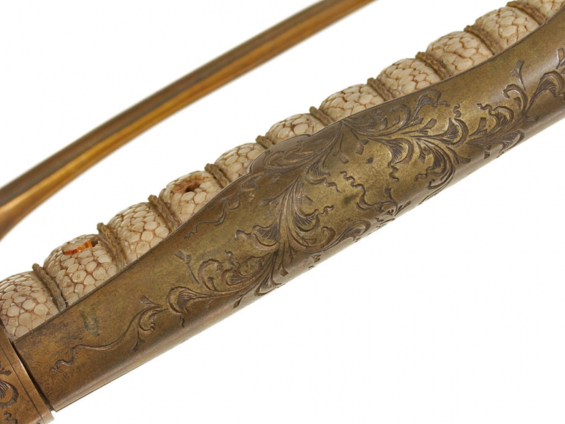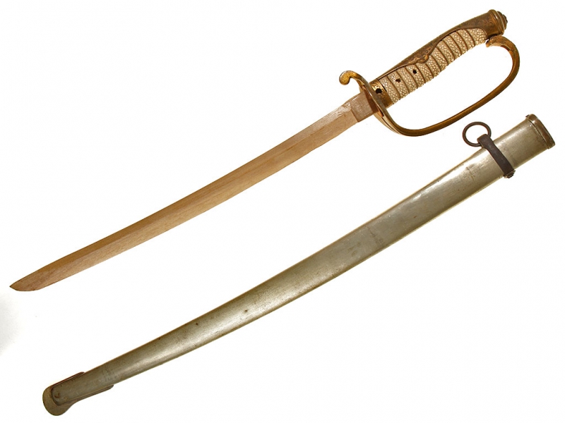 Оправа для меча кю-гунто образца 1875 / 1886 года для старшего офицерского состава (майор, подполковник, полковник), изготовленная в начале ХХ века. Вместо клинка вставлена деревянная модель, повторяющая по форме боевой клинок традиционного самурайского меча (судя по размеру, в представленном экземпляре использовался фамильный клинок вакидзаси). Рукоять обтянута кожей ската (самэ) белого цвета, прибор рукояти латунный, спинка рукояти полностью украшена гравированными узорами в виде листьев и кадосакуры. Частично сохранилось оригинальное золочение. Ножны металлические никелированные, с одной обоймицей "аси", с деревянной вставкой внутри.