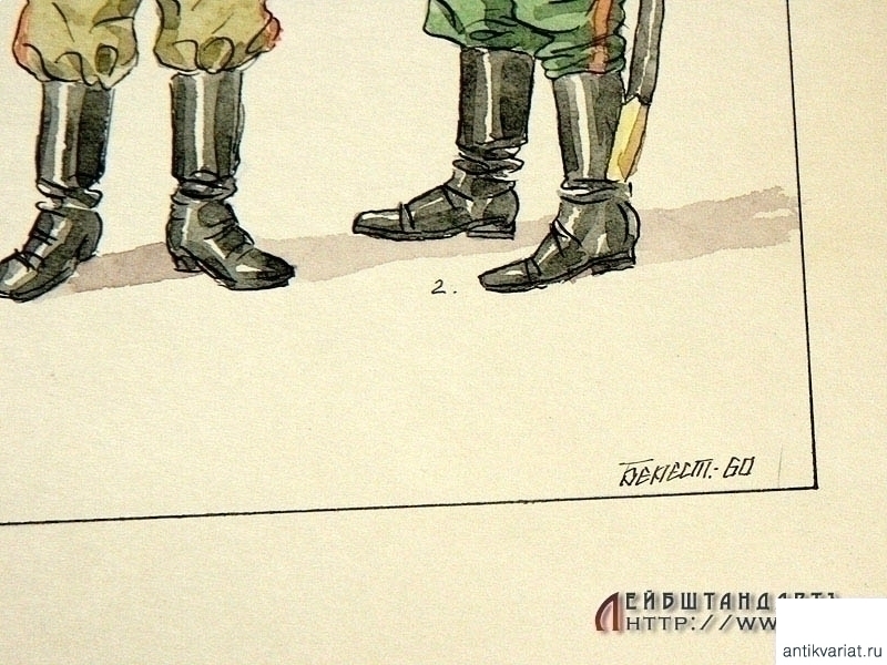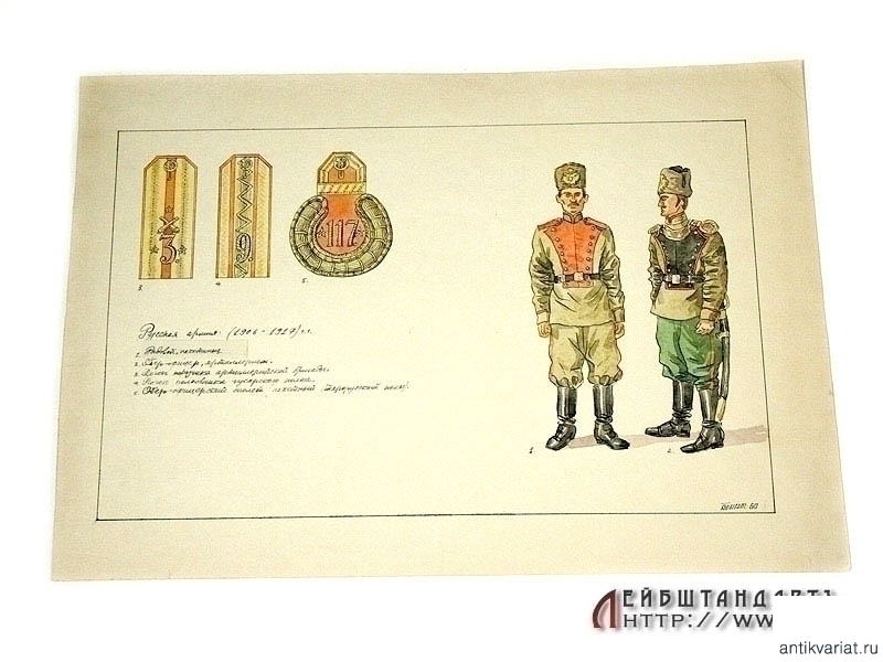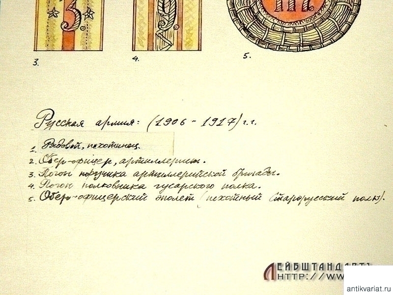 Рисунок тушью и акварелью на бумаге, размером 39 х 27 см, изображающий образцы формы и погон русской армии 1906 - 1917 годов. В правом нижнем углу - нанесенная акварелью подпись художника "Берест" с датой: 1960 год. Возможно, данный рисунок служил в качестве иллюстрации для методического пособия.