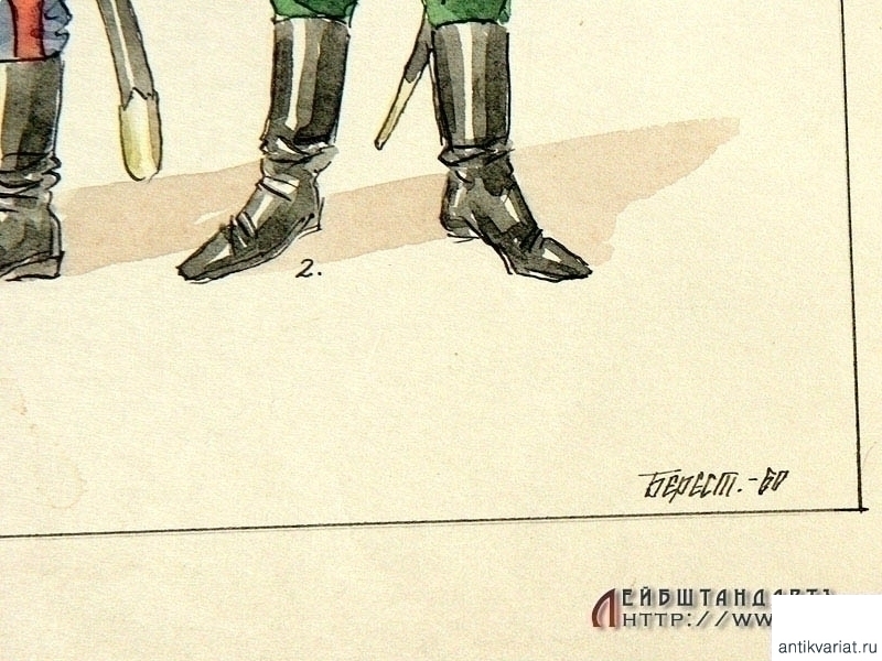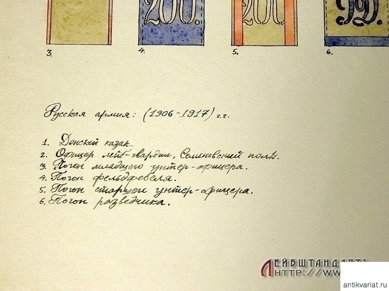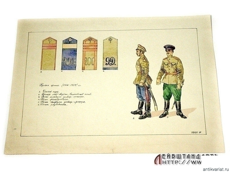 Рисунок тушью и акварелью на бумаге, размером 38,5 х 27 см, изображающий образцы формы и погон русской армии 1906 - 1917 годов. В правом нижнем углу - нанесенная акварелью подпись художника "Берест" с датой: 1960 год. Возможно, данный рисунок служил в качестве иллюстрации для методического пособия.