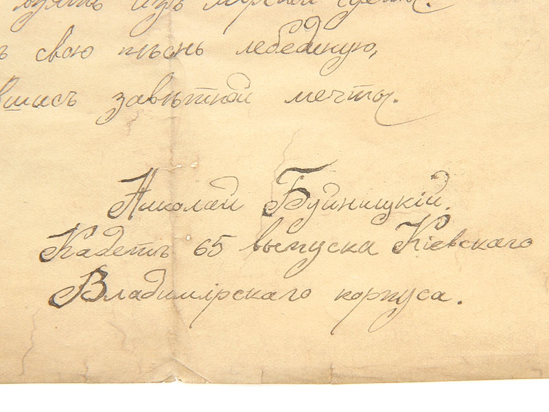 Рукописное стихотворение периода Гражданской войны "Памяти Л.Г.Корнилова", написанное Николаем Буйницким, кадетом 65-го выпуска Киевского Владимирского корпуса.
