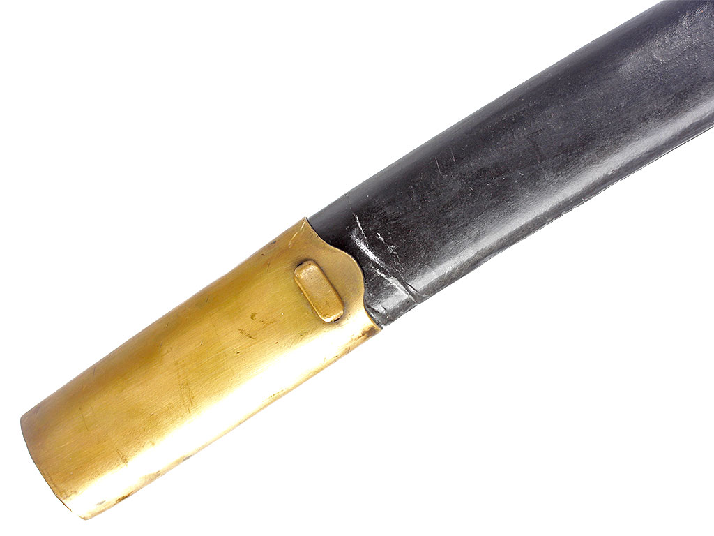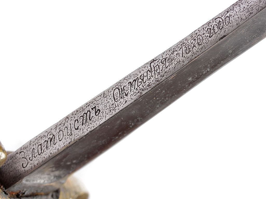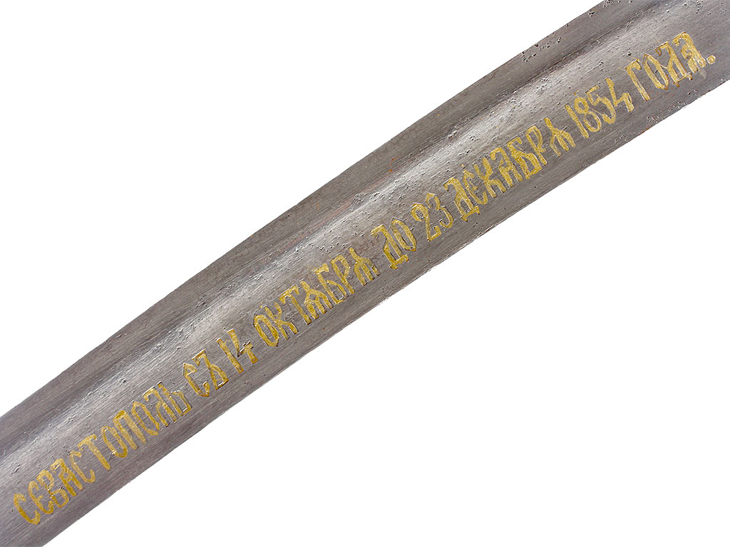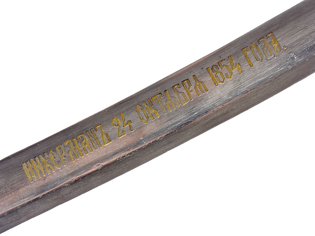 Сабля нижних чинов драгунского типа образца 1841 года. Клинок незначительной кривизны, с одним широким долом; при сборке использован более ранний клинок с надписью на обухе "Златоустъ Октября 1820 года". Травленые надписи на обеих сторонах клинка нанесены в наше время (травление неглубокое, и при желании их несложно удалить). Рукоять деревянная, с наклонными продольными желобками, обтянута черной кожей, перевита по желобкам витой латунной проволокой. Прибор гарды латунный, с приемочным клеймом в виде буквы "К". Ножны деревянные, обтянутые кожей, с двумя гайками с кольцами для подвешивания к портупее и башмаком. Кожа на ножнах отреставрирована в наше время.
