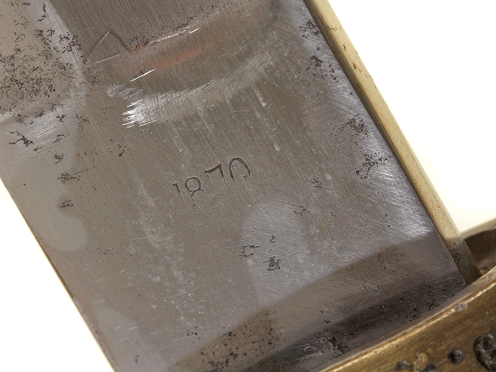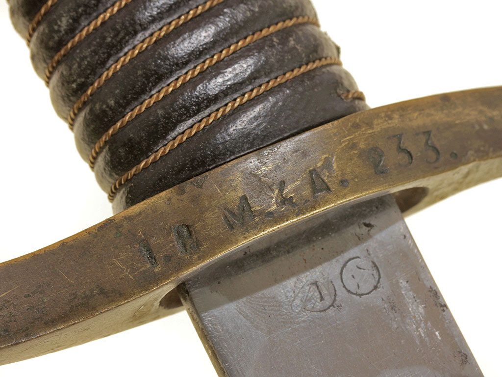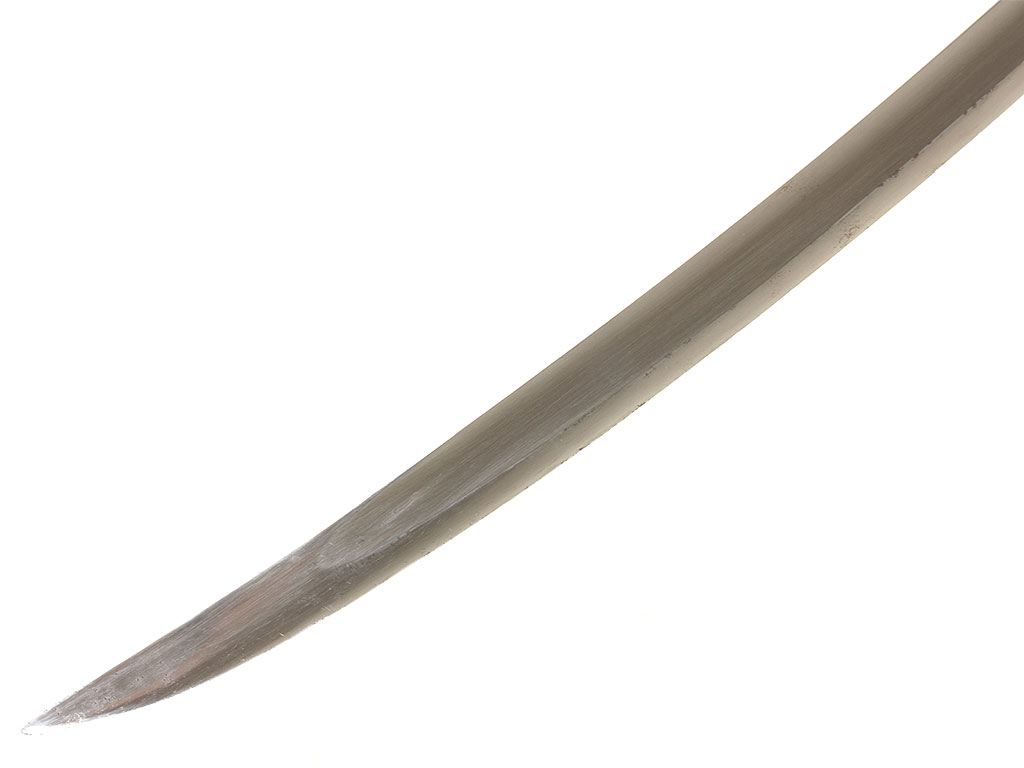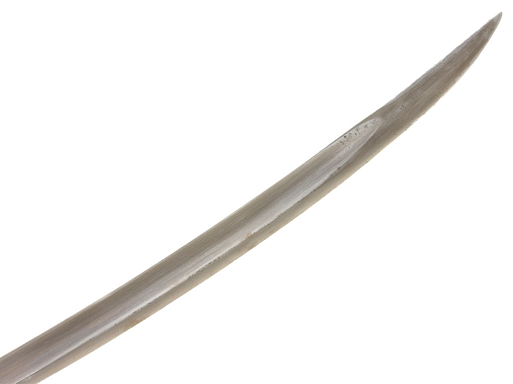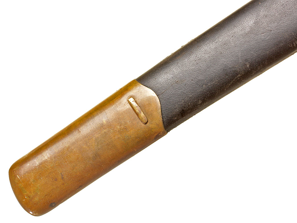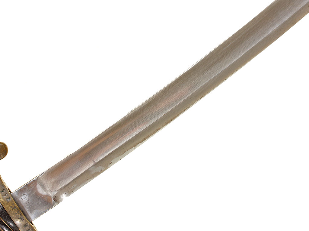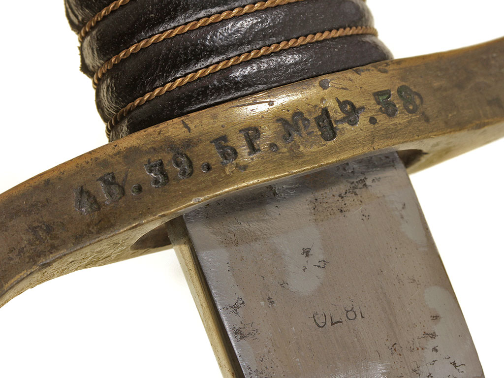 Сабля нижних чинов драгунского типа образца 1841 года. Клинок незначительной кривизны, с одним широким долом, у основания клинка имеются клейма военной приемки, затертое клеймо Златоустовского оружейного завода и указан год производства - 1870. Рукоять деревянная, с наклонными продольными желобками, обтянута темно-коричневой кожей, перевита по желобкам витой латунной проволокой. Прибор гарды латунный, с клеймом полковой принадлежности "4 б. 39. БР." и номером оружия в подразделении - "58". Ножны деревянные, обтянутые кожей, с двумя гайками с кольцами для подвешивания к портупее и башмаком. Кожа на ножнах отреставрирована в наше время.
