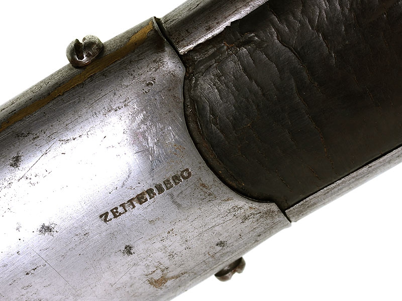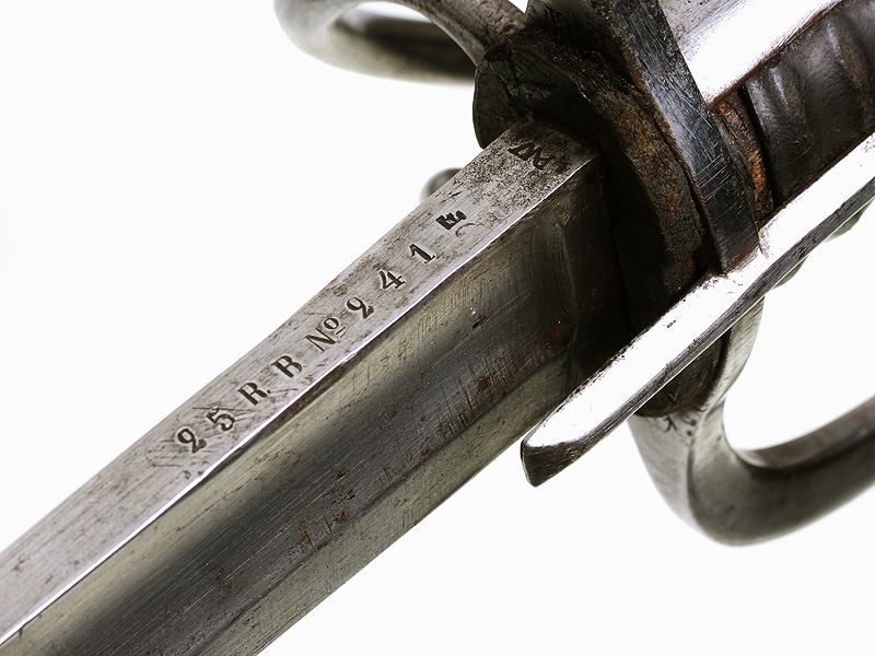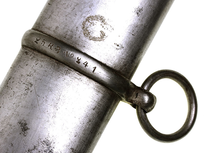 Солдатская кавалерийская гусарская сабля гвардейских частей образца 1825 года. На обухе клинка имеется полковое клеймо "25 R.B. № 241" и клейма военной приемки. Рукоять из обтянутого черной кожей дерева, прибор рукояти стальной. Ножны деревянные, обтянутые черной кожей и оправленные железом. На ножнах имеется клеймо изготовителя "Zettenberg" и полковое клеймо с номером, совпадающим с номером на клинке.