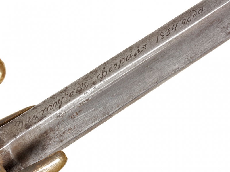 Сабля кавалерийская солдатская образца 1827 года, изготовленная в Златоусте в 1834 году. Клинок с одним широким долом, у основания имеются многочисленные клейма военной приемки, а на обухе - гравированная надпись "Златоустъ февраля 1834 года". Рукоять деревянная, обтянутая кожей, по бокам две овальные бронзовые заклепки. Гарда представляет собой крестовину с перекрестием и тремя дужками. Ножны стальные, с двумя гайками с кольцами для подвешивания к портупее и башмаком.