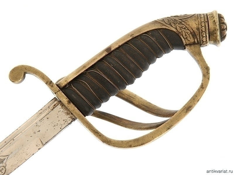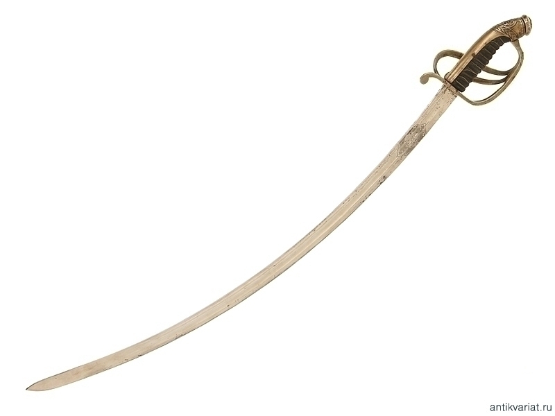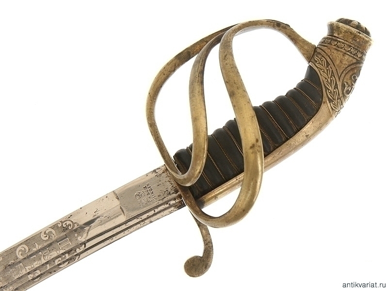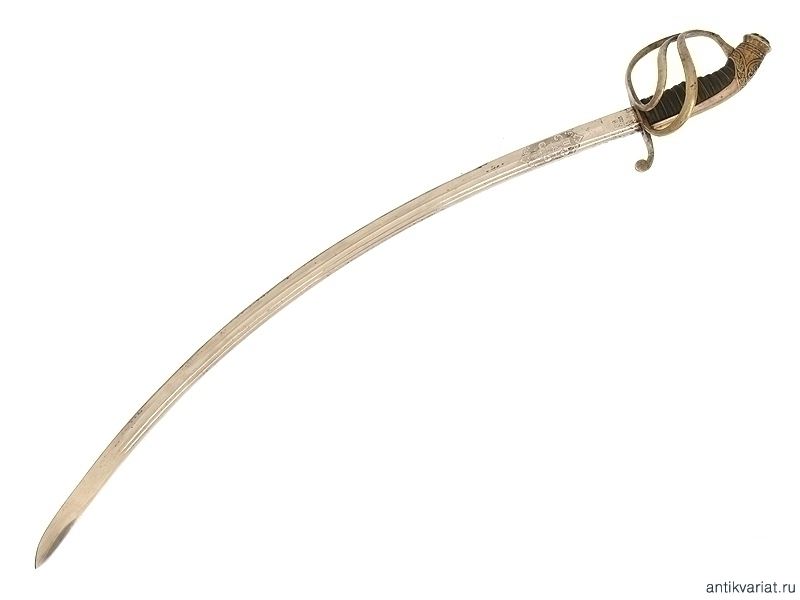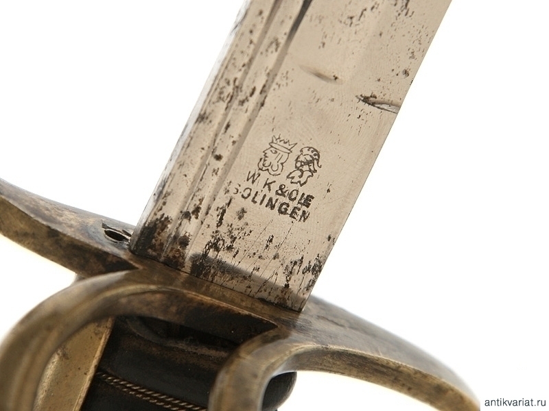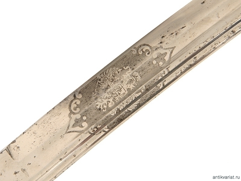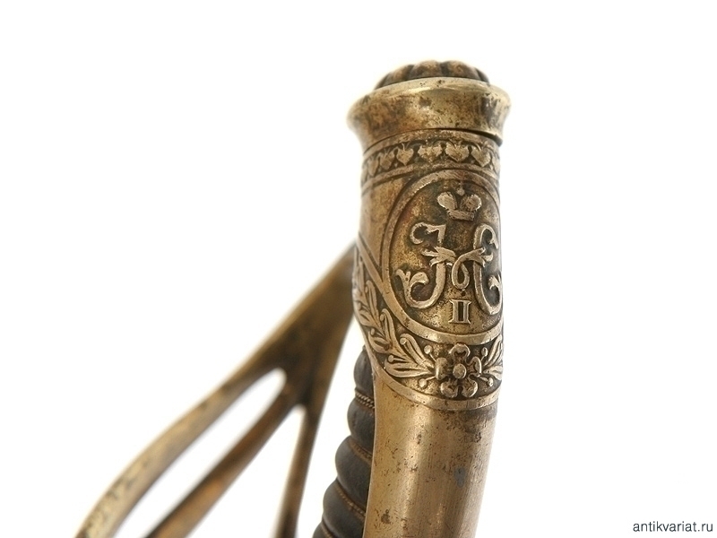 Сабля в прекрасном состоянии, клинок изогнутый, маркирован клеймом немецкой фирмы "WKC Solingen", на обеих сторонах расположены травленые медальоны с гербом Российской Империи и вензелем Императора Николая II. Эфес бронзовый в остатках золочения, рукоять обтянута кожей с витой проволокой, фигурная втулка украшена вензелем Николая Второго, в царствование которого владелец получил первый офицерский чин.