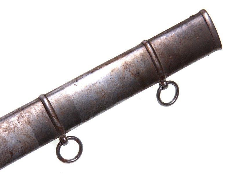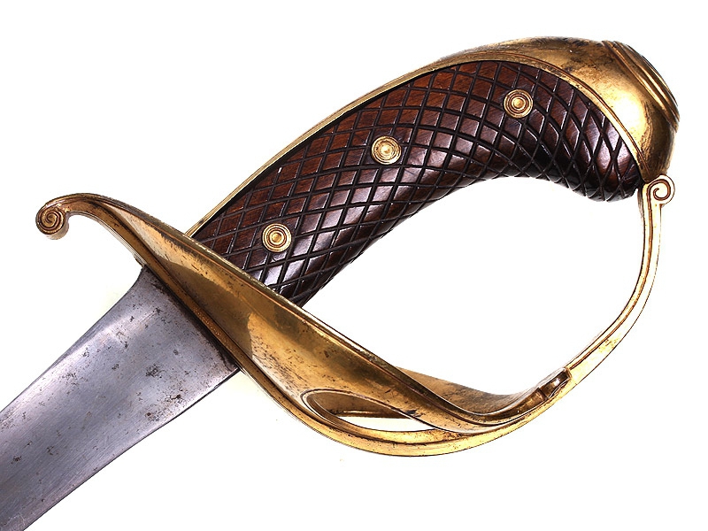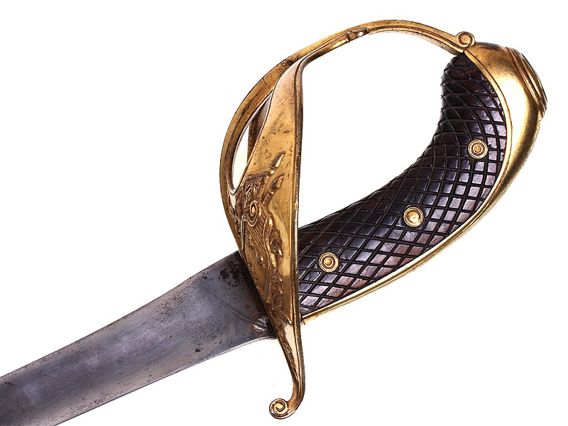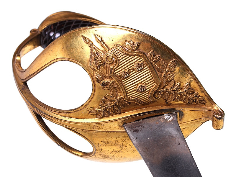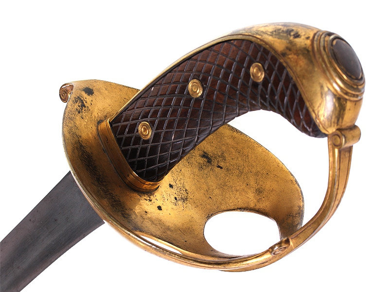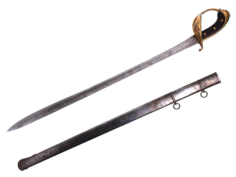Офицерская кавалерийская сабля образца 1849 года. Клинок без клейм. Рукоять из дерева, покрыта крестообразной насечкой, прибор рукояти латунный вызолоченный. На гарде - накладное изображение геральдического щита с гербом Швеции в кружении военной арматуры. Ножны металлические.
